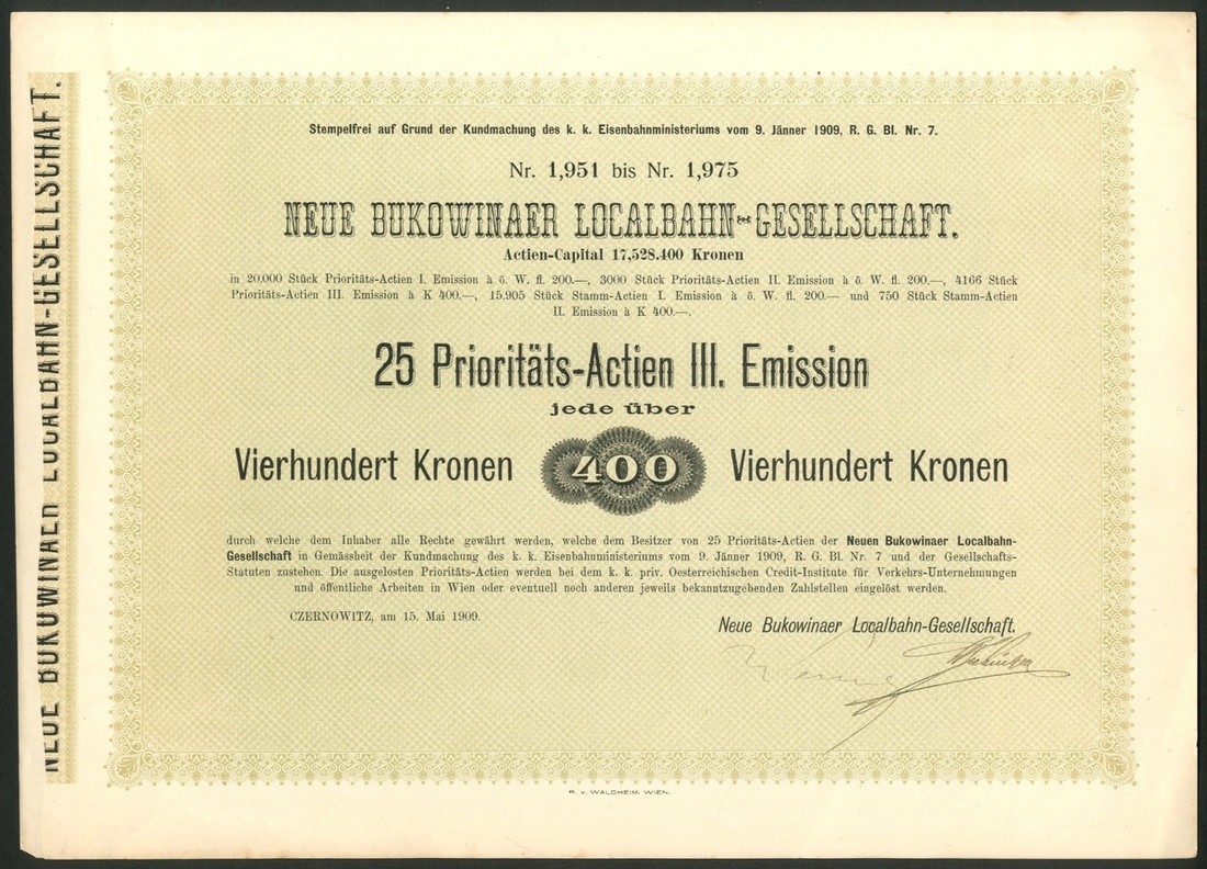 Austria-Hungary/Romania: Neue Bukowinaer Localbahn-Gesellschaft, 25 preference shares, 3rd issue, 400 kronen, 1909, #1951-1975, black with green underprint, with coupons. Formed in 1897 to manage a series of local and narrow gauge railways in Bukoviner, a region on the Romanian - Ukranian border. EF.