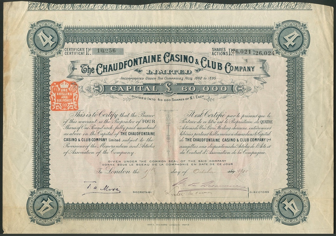Belgium: Chaudfontaine Casino & Club Co. Ltd., 4 shares of £1 each, London 189[1900], #10256, ornate border, grey, text in English and French, with coupons. English company owning the casino at Chaudfontaine. Although the company is long gone the casino is still operational today. Staining to left edge, AVF.