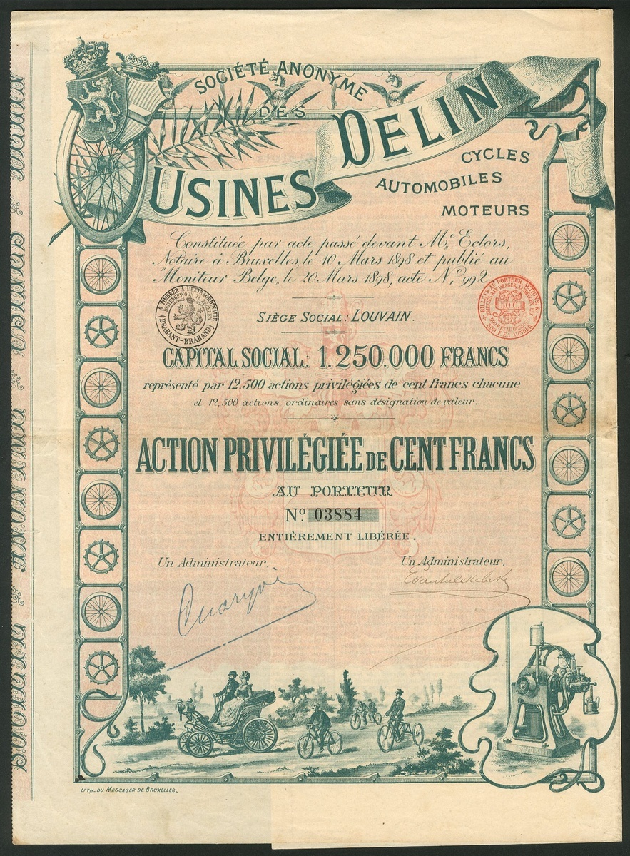 Belgium: Société Anonyme des Usines Delin Cycles, Automobiles, Moteurs, 100 francs preference share, Louvain, 1898, #3884, very attractive piece with vignettes of automobile and cyclists at bottom, wheel and coat of arms at top left, green and pink, with coupons. GVF.