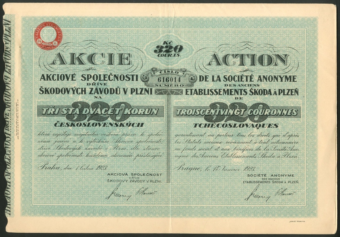 Czechoslovakia: S.A. des Anciens Etablissements Škoda à Pilzen, 320 couronne share, Prague 1923, #616014, black with blue underprint, with coupons. A large industrial concern mainly manufacturing arms which acquired Laurin & Klement in 1925 to develope a motor car division. VF.