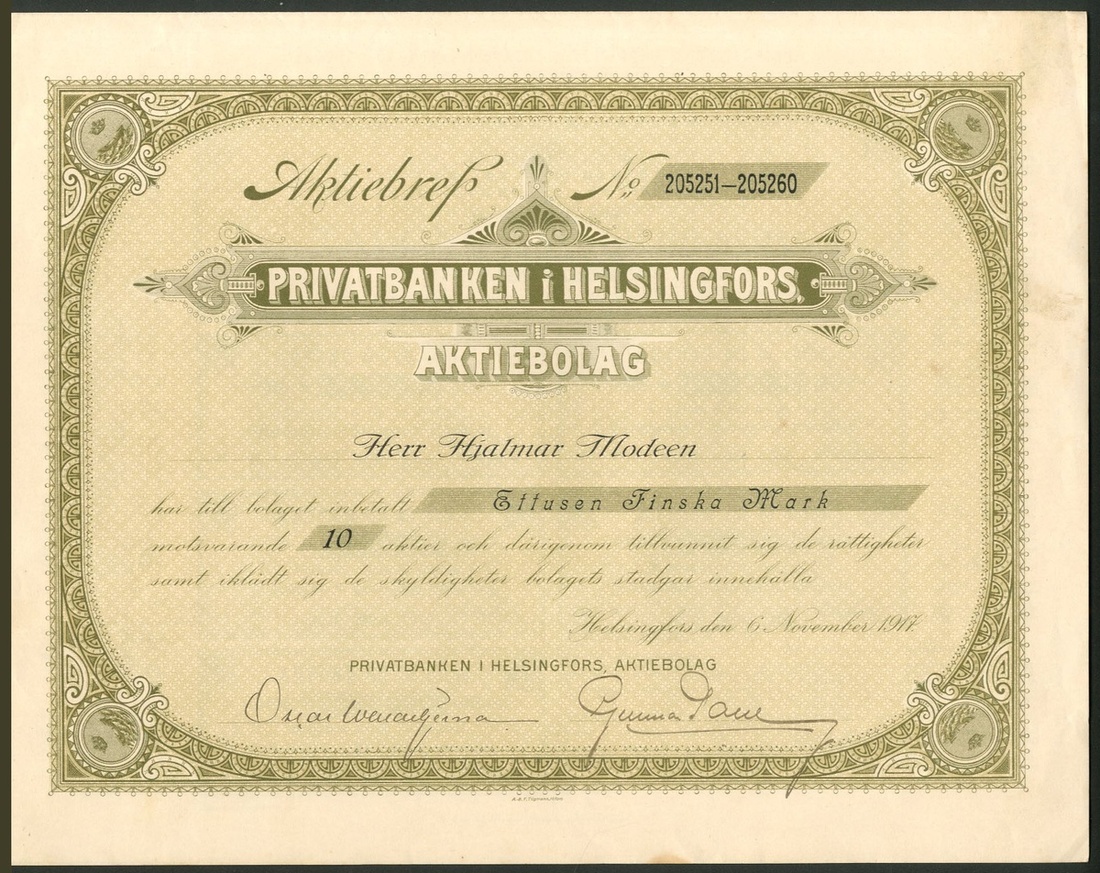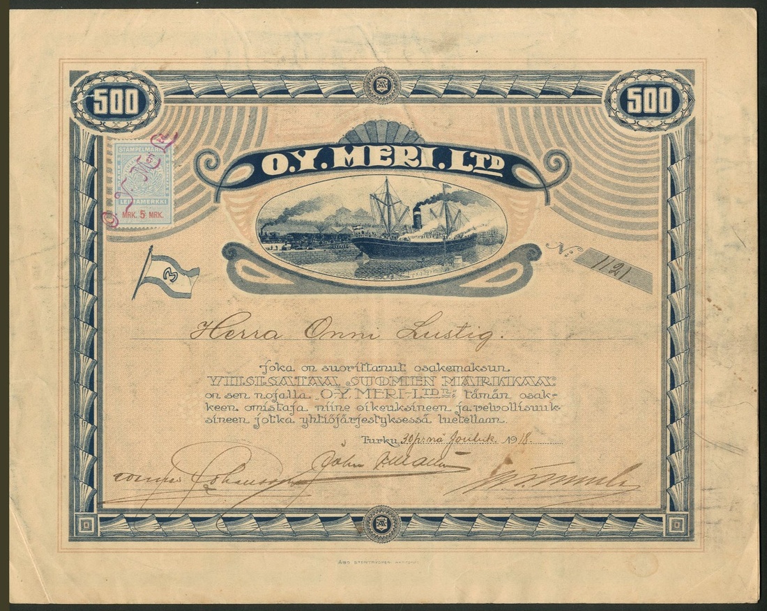 (x) Finland: A selection,comprising O.Y.Meri Ltd., 500 markka share, Turku 19[18], #1121, ship at dockside; TURVA Maakauppiaitten Palovakuutus-Osakeyhtio, 250 markka share, Vaasassa 1915, #3026; Privatbanken i Helsingfors AB, 10 shares, 1917, #205521-260, and, Vaasan Puuvilla Uy, 10 shares of 800 markka, 1940, #1042. The first with grubby surface and tear at left edge, the rest VF-EF (4).