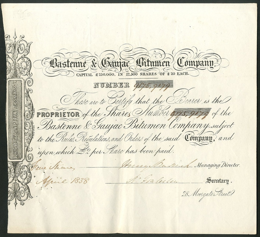 France: Bastenne & Gaujac Bitumen Company, £20 bearer shares, [1838], #9175-9179, decorative black printing. Acquiring its natural bitumen from these locations in South West France, the company laid experimental pavements in Oxford Street, London, in competition against several other companies in 1839. GVF and scarce.