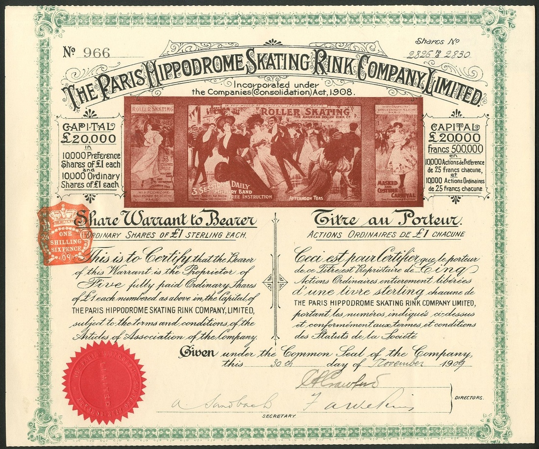 France: Paris Hippodrome Skating Rink Co. Ltd., bearer warrant for 5 ordinary shares of £1, 19[09], #966, lovely vignette of the Art Nouveau posters advertising the skating rink, text in English and French, green and brown, with coupons. The Hippodrome was opened in 1900 during the Paris Exposition in Place Clichy and was home to various shows including Bostock's Circus. Opened as a Cinema by Compagnie des Cinama-Halls in 1907 but then passed to this company at the height of roller skating boom. Taken over by Geaumont and renamed Gaumont-Palace to become the largest cinema in the world. EF and scarce.