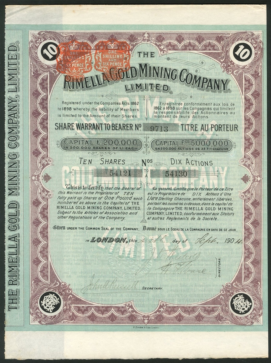Italy: Rimella Gold Mining Co. Ltd., pair of certificates for 5 shares of £1, 190[3], #4530 and 10 shares of £1, 190[4], #9713, ornate borders, text in English and French, with coupons. Registered in England to acquire the Rimella Gold Mines in the Province of Vercelli, Northern Italy. VF-EF (2).