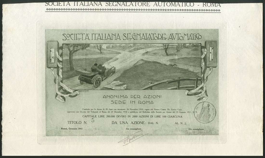 Italy: Soc. Italiana Segnalatore Automatico, 100 Lire share, Rome, 1911, #5, large pencil sketch styled vignette at top of motor vehicle with large illuminated headlight, signed by Nino Bertoletti, black and grey, with coupons. GVF.
