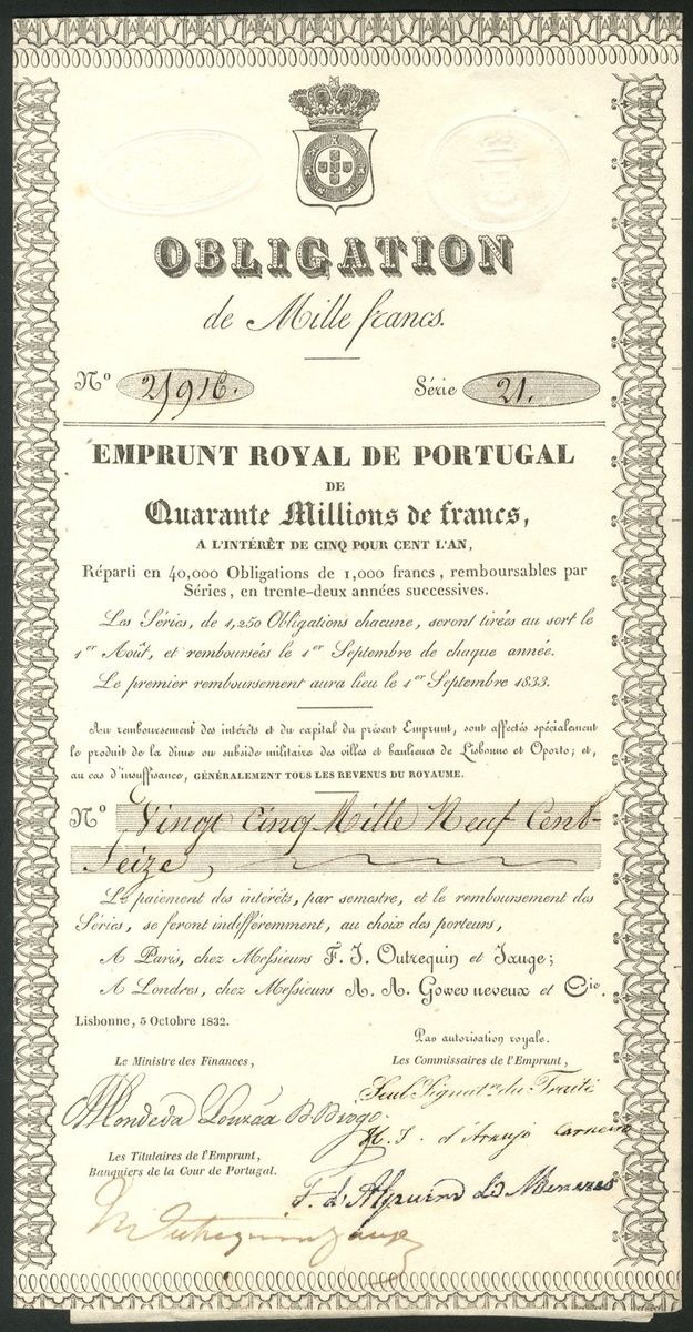 Portugal: Emprunt Royal de Portugal, bond for 1000 francs, Lisbon 1832, #25916, decorative border, black, with coupons. GVF.