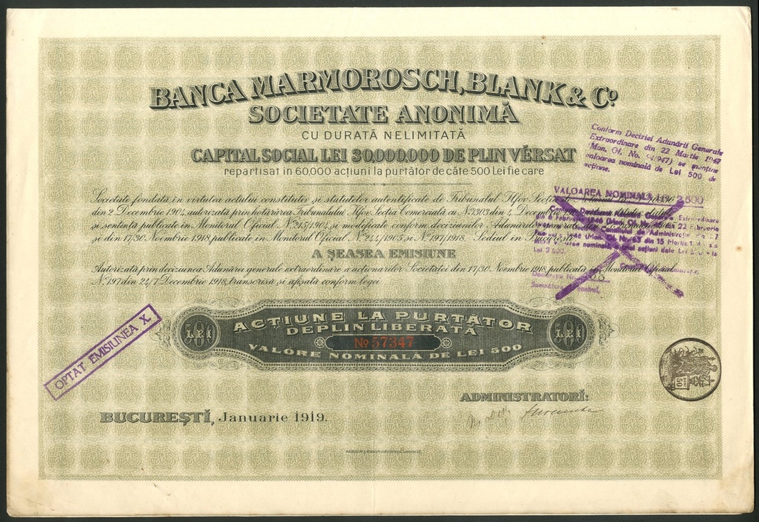 Roumania: Banca Marmorosch, Blank & Co., bearer share for 500 Lei, 1919, #57347, black with green underprint. Founded in 1848 by Jewish banker Jacob Marmorosch and Jacob Loebel, gaining this title in 1874. The bank grew in importance and its capital had risen to 30,000,000 lei by 1918. Following WWI there was an initial period of prosperity but when the depression hit after 1929 the bank was forced into liquidation with charges of fraud against Aristede Blank who managed the company. All banks in Romania were nationalised in 1948. VF.