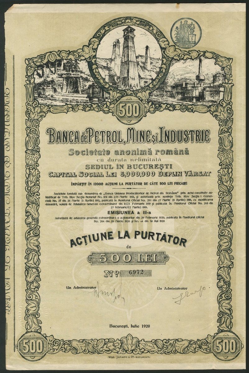 Roumania: Banca de Petrol, Mine si Industrie, 500 lei share, Bucarest 1920, issue IIIa, #6972, vignette of of oil well, mine entrance and factory, green, with coupons. VF-EF.