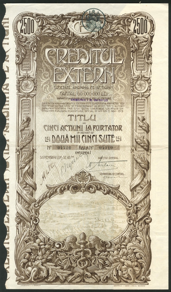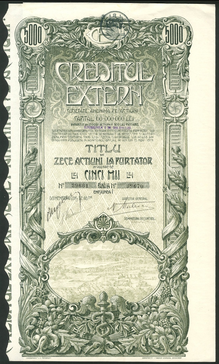 Roumania: Creditul Extern, pair of certificates for 10 shares of 500 Lei and five shares of 500 Lei, both 1919, bold decorative border with coastal scene at bottom, green and brown respectively, both with coupons. EF (2).