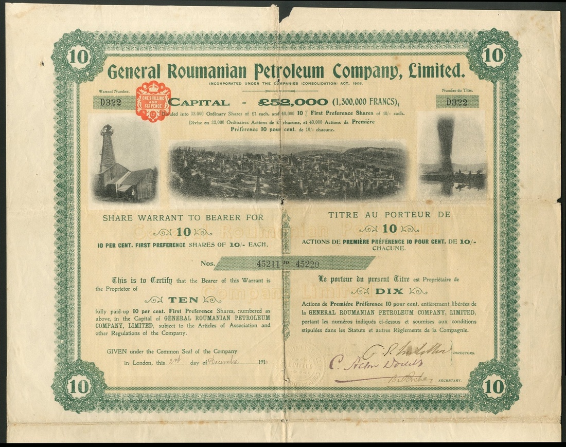 Roumania: General Roumanian Petroleum Co. Ltd., a pair of certificates for first preference shares of 10/- each, 10 shares, 191[0], #D322, green and 5 shares, 191[0], #C137, red, oilfield scenes at top, ornate borders, both with coupons. Both worn on folds, small chip from top edge of the first, the second toned overall, AVF (2).