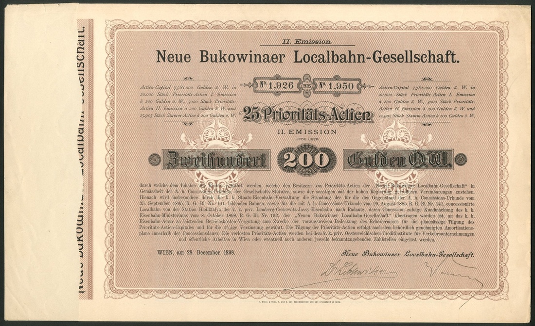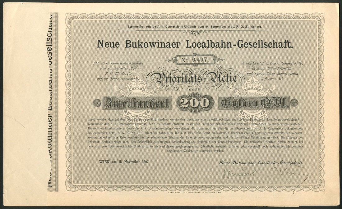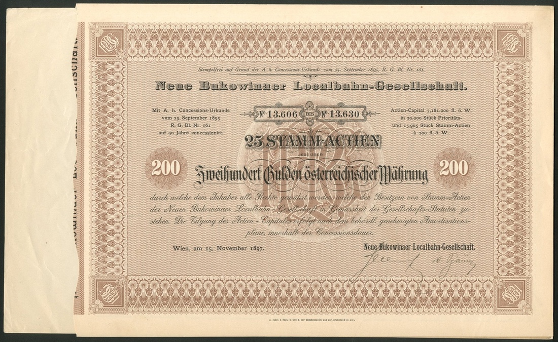 Roumania: Neue Bukowinaer Localbahn-Gesellschaft, 25 stamm-actie (common shares) of 200 gulden, Vienna 1897, #13606-13630, together with 1 priority share, 1897, #0497 and 25 priority shares, II emission, 1898, #1926-50, all with coupons. generally EF (3).