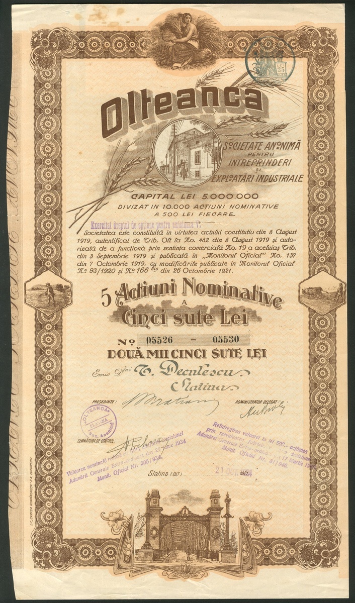Roumania: Olteanca, S.A. pentru Intreprinderi si Exploatari Industriale, 5 shares of 500 Lei each, Slatina 1921[24], #05526-05530, decorative piece with vignette of Slatina Bridge, ornate border, brown, 1 coupon remaining. Edge tear at left, otherwise VF.