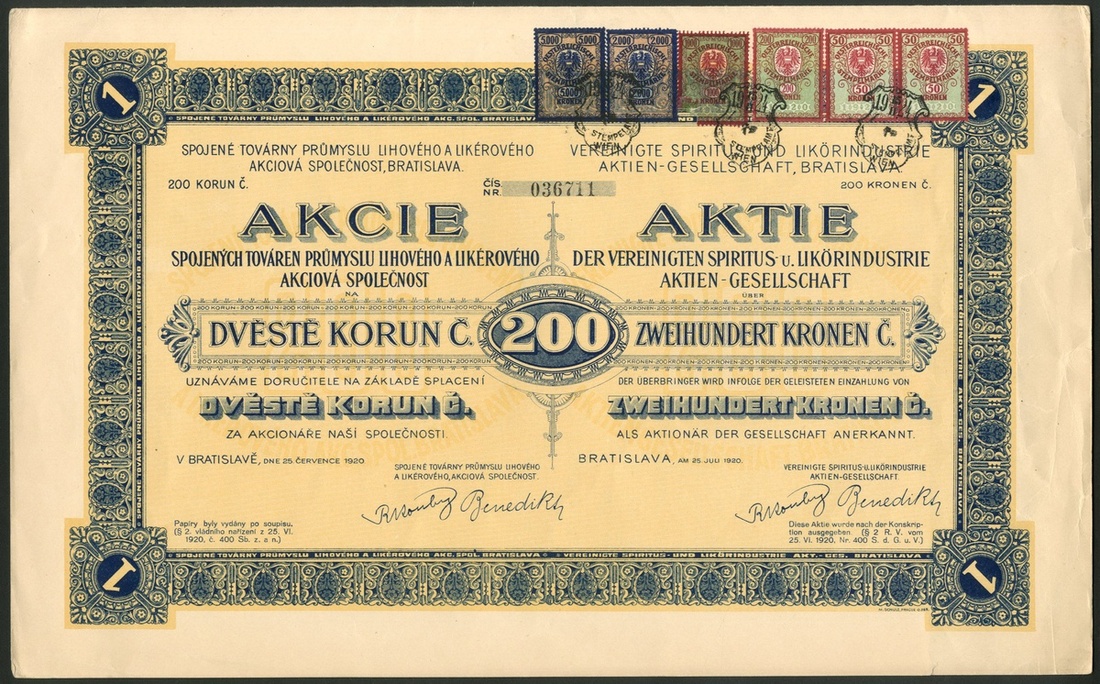Slovakia: Vereinigten Spiritus und Likörindustrie (United Spirit and Liquer Industry), 200 kronen share, Bratislava 1920, #036711, ornate border, blue with yellow underprint, with coupons. EF.
