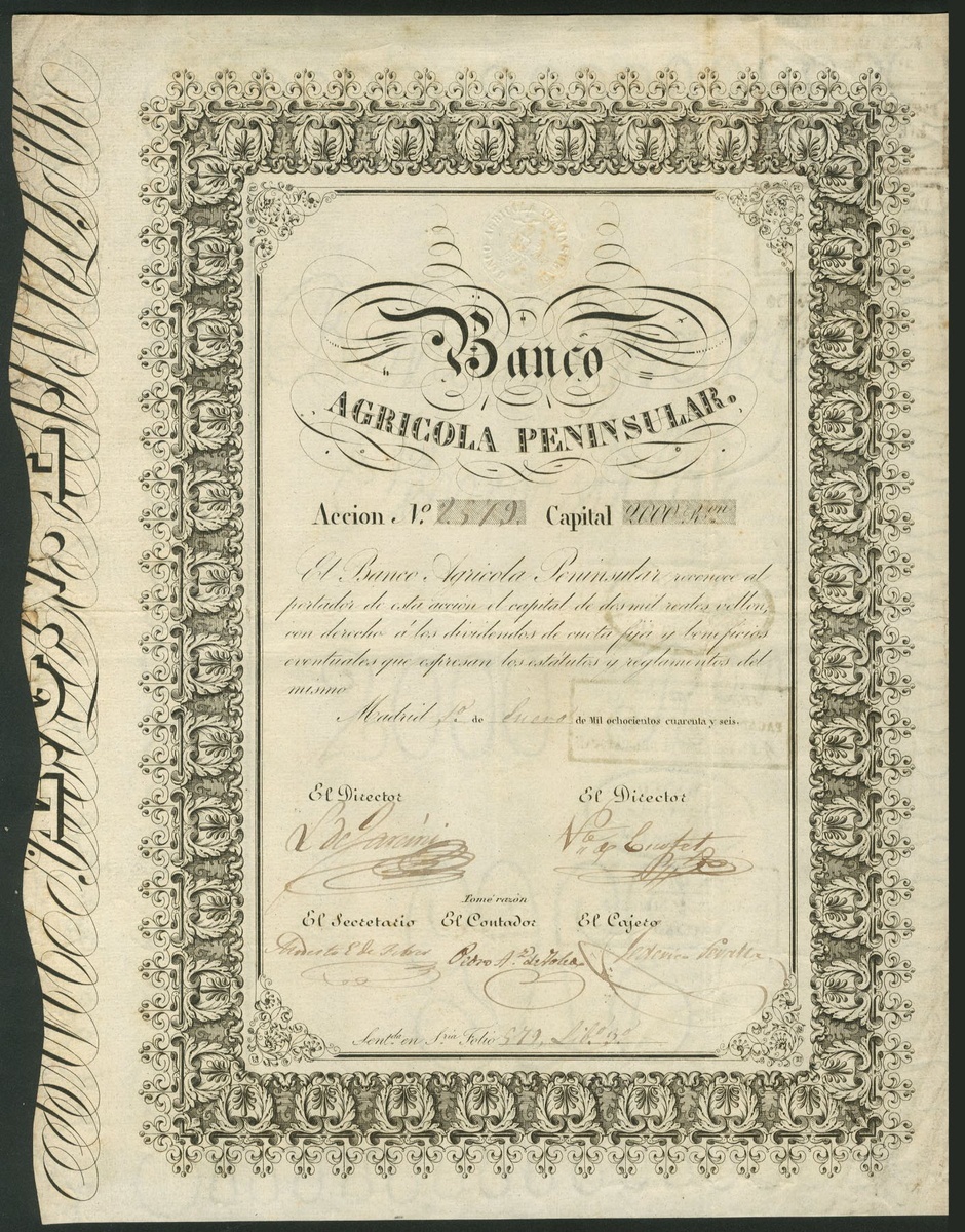Spain: Banco Agricola Peninsular, 2000 reales vellon share, 1846, #2579, ornate border, black, with coupons. Formed by statute in Madrid in 1845. Some repairs at left edge, VF.