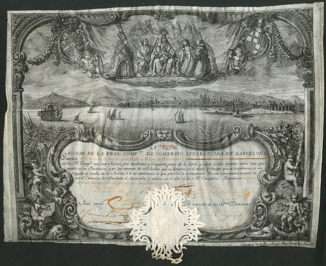 Spain: Real Compania de Comercio Establecida en Barcelona, 250 peso share #1296, 1758, probably the best known and most attractive of the early Spanish trading companies sporting a panoramic vignette of Barcelona Harbour and the Virgin of Montserrat and more, black, on vellum, ornate seal which is intact. The company was granted a monopoly of trade to Santo Domingo, Puerto Rico and Margarita Island (off the coast of Venezuela). Sales of shares were disappointing and the company was unable to expand as it had hoped. Given the right to trade into Buenos Aires in 1771. Taken over by the Real Compañia de Filipinas in 1785. Seal virtually intact but fragile, VF and scarce.
