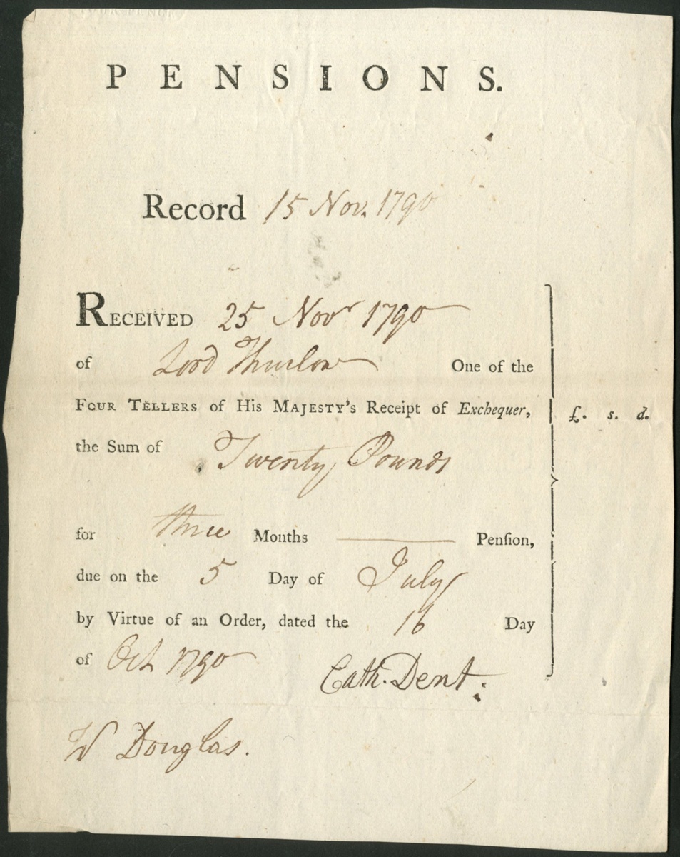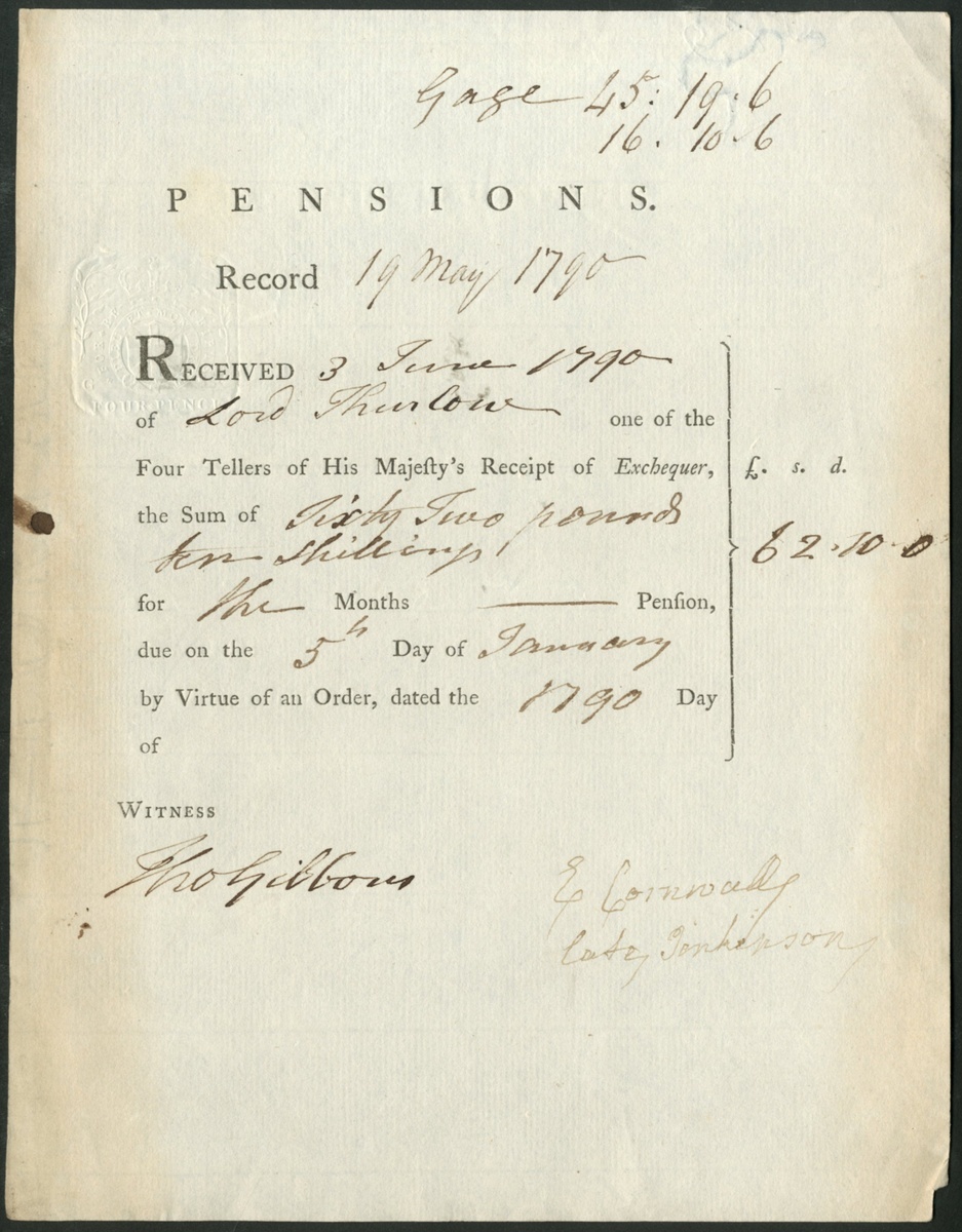 Great Britain: Government Pensions, a pair of exchequer receipts, in the name of Lord Thurlow, both dated 1790, making payments of £62 10 shillings and £20, for 3 months pension, black printing with manuscript insertions, different printing, embossed duty stamp on the first only. Lord Thurlow (1731-1806), served as Lord Chancellor under 3 Prime Ministers, 1778-1792. Trimmed as usual VF (2).