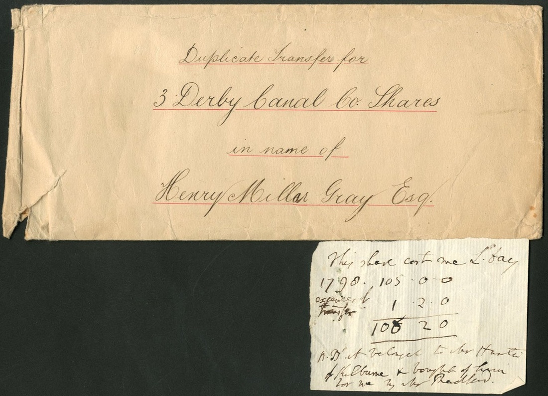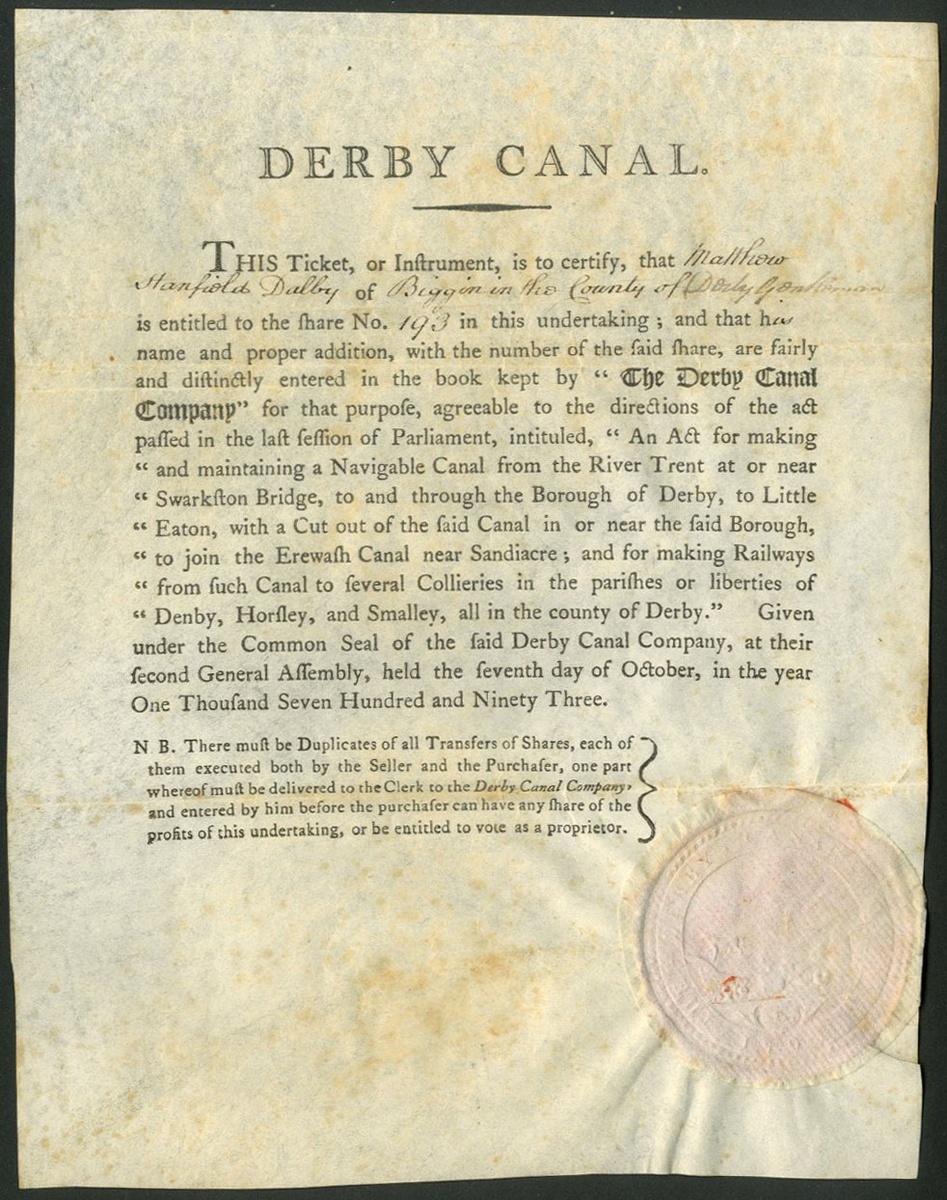 Great Britain: Derby Canal Company, certificate for one share, 1793, #193, small format piece printed in black, on vellum, waxed paper seal attached at lower right. Together with handwritten receipt, 1798 and later envelope. The company obtained its Act of Parliament in 1793 to build a canal from the River Trent at Swarkston Bridge to Little Eaton and to join the Erewash Canal near Sandiacre. The Act also provided for the building of railways to connect the surrounding coal mines to the canal and is one of the very few pieces to have this part of the Act printed on the certificate. A single span cast iron aqueduct was built as part of the route and was the first of its kind. In financial difficulties due to competition from the railways by the 1850's but struggled on until 1964 when permission was granted for the canal to be closed altogether. GVF and rare (2)