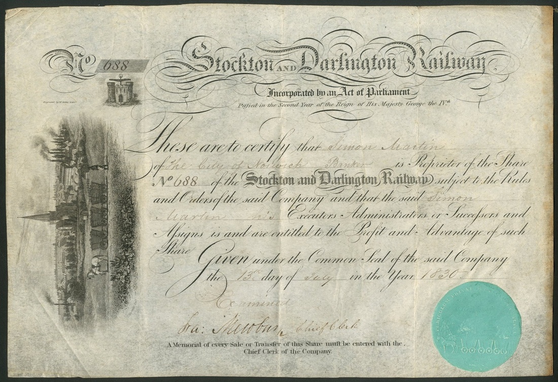 Great Britain: Stockton & Darlington Railway, certificate for one share, [1830], #688, attractive vignette at left, black printing on vellum. Originally a horse tramroad incorporated in 1821, to run the 25 miles between the 2 towns with branch lines to collieries and the river Tees. Converted to allow steam locomotives in 1823, finally opened in 1825. The worlds first railway authorised to carry passengers using steam locomotives. This certificate is the first 'type 2' to be seen with the addition of J Macauley" under vignette (see www.scripoworld.com). VF and extremely rare.