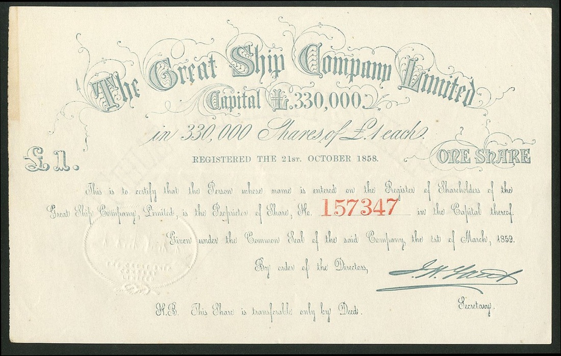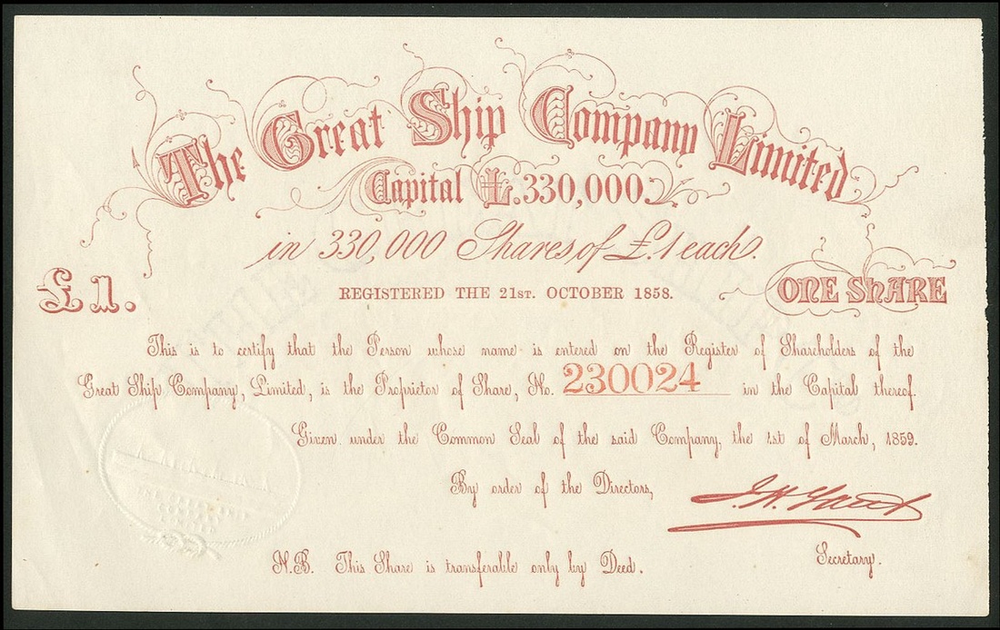 Great Britain: Great Ship Company Ltd., a group of certificates for £1 shares, all dated March 1859, 3 are printed in green and 2 in red but otherwise identical, embossed seal depicts the S.S. Great Eastern. The Great Eastern was commissioned by The Eastern Steam Navigation Company and built at John Scott Russell's yard at Millwall to the designs of Isambard Kingdom Brunel. It was then the largest ship in the world. It had a chequered history due to the bankruptcy of Scott Russell and the lack of funds with the Shipping Company. This company purchased the ship after its launch and proceeded to fit it out ready for service. Made several voyages until 1863 when losses forced the company to lay up the ship. It was sold in 1864 as a cable laying vessel and the rest of its life was spent as a concert hall and a floating advertising hoarding. Broken up in 1889-90. VF-EF (5). NO RESERVE.
