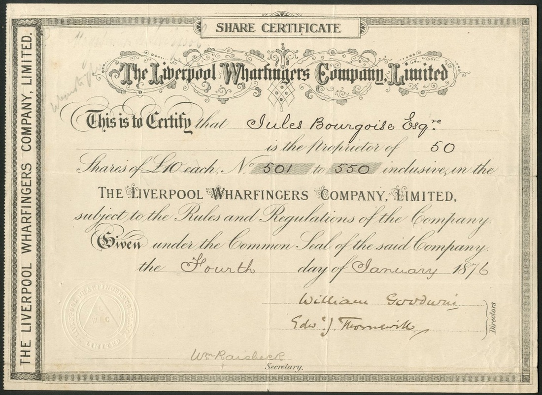 Great Britain: Liverpool Wharfingers Co. Ltd., £10 shares, 187[6], #501-550, decorative title, embossed seal, black. Very slightly weak at edge where folded, VF.