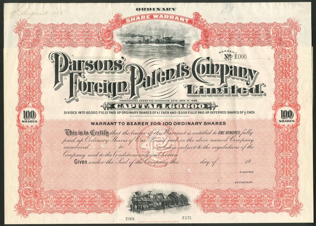 Great Britain: Parsons' Foreign Patents Company Limited, bearer warrant for 100 ordinary shares of £1, 19- (circa 1905), a specimen certificate from the Bradbury, Wilkinson & Co. archive, vignette of steamship at top, turbine at bottom, red and black, with coupons. Sir Charles Algernon Parsons was best known for the invention of the compound steam turbine which had a great influence in ship engineering. Traces of mounting on reverse otherwise EF and scarce..