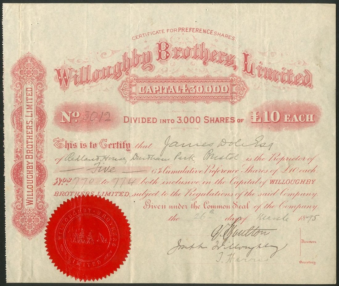 Great Britain: Willoughby Brothers Ltd., £10 preference shares, 18[95], #3012, decorative red printing. Shipbuilders at Central Foundry, Plymouth, building mainly tugs, coastal traders and the ferries at Saltash.. VF.