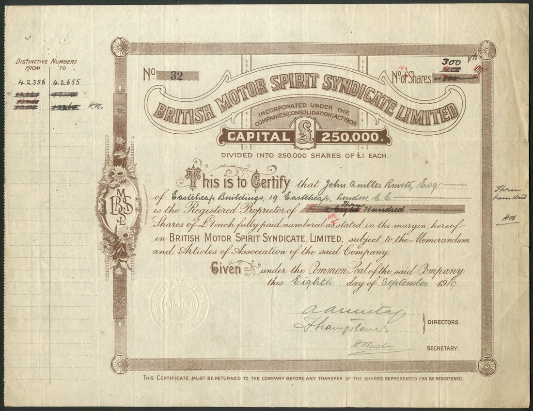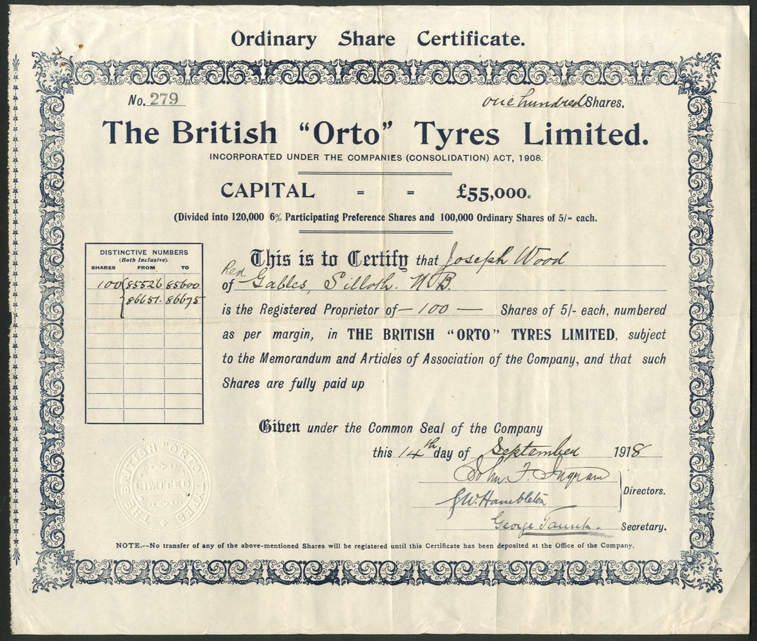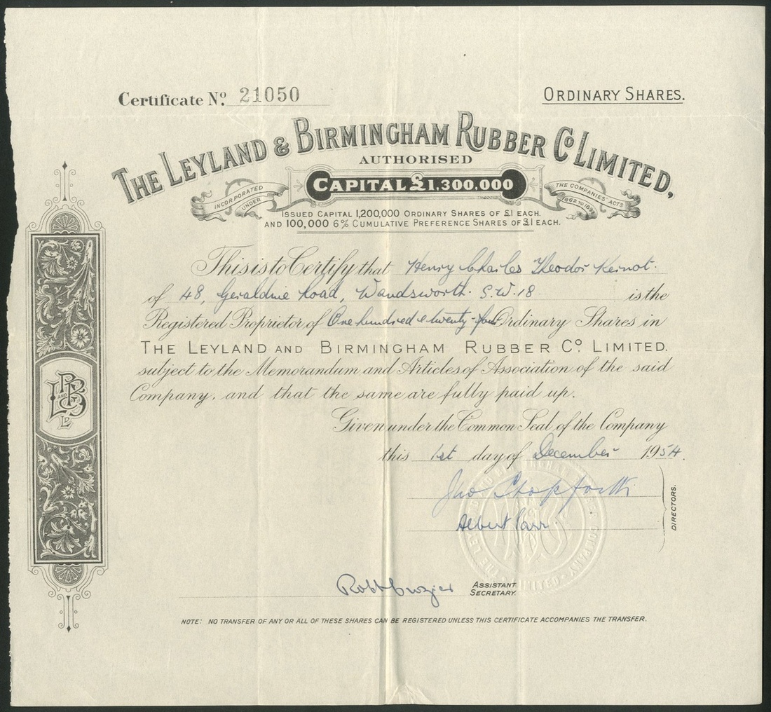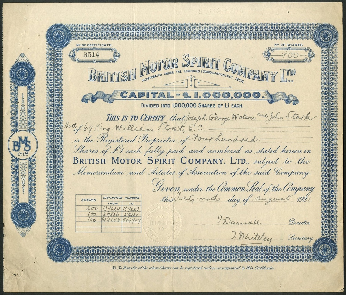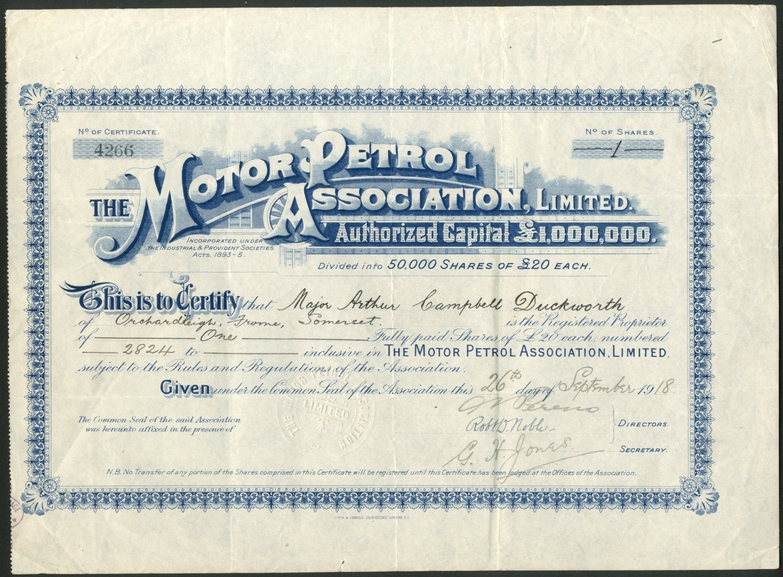 Great Britain: A collection of motoring related certificates (11), comprising A. Vedrine & Co. Ltd., £1 ordinary shares, 190[7], #1067, green. Motor body builders in Paris. Rare nominative certificate; together with Charron Ltd., 1929; Motor Petrol Association, 19[18]; British Motor Spirit Co. Ltd., 192[1]; British Motor Spirit Syndicate Ltd., 19[19], scarce type; Hoyal Body Corporation (1928) Ltd., 19[28]; British 'Orto' tyres Ltd., 191[8]; Gare Patent Tyre & Wheel Co. Ltd., 19[24]; A. Rist (1927) Ltd., 19[28], motor horn manufacturers at Lowestoft, and, Leyland and Birmingham Rubber Co. Ltd., 2 types 1954 and 1959. Generally VF or thereabouts (11).