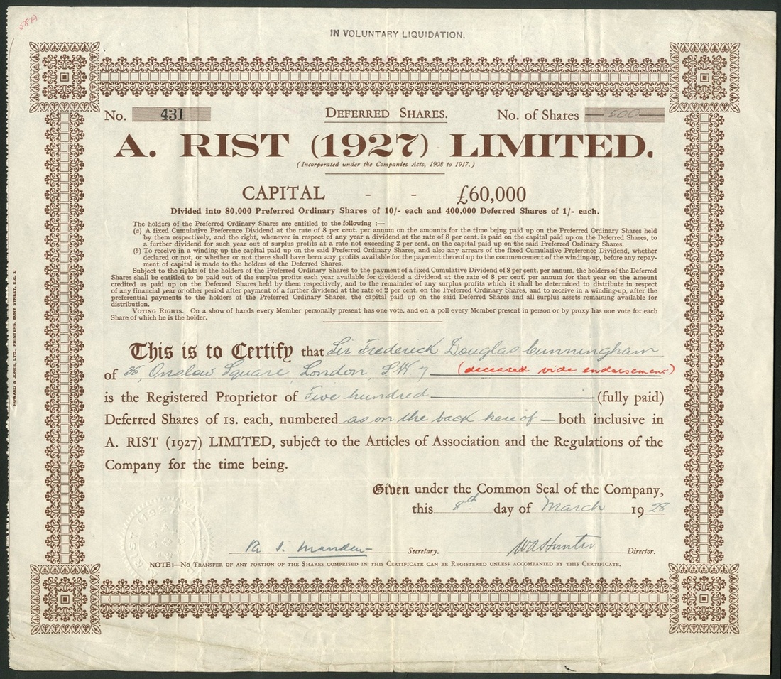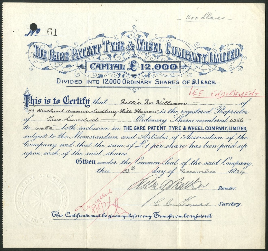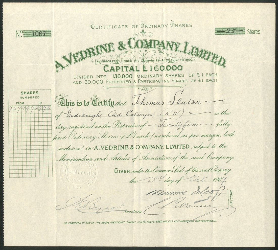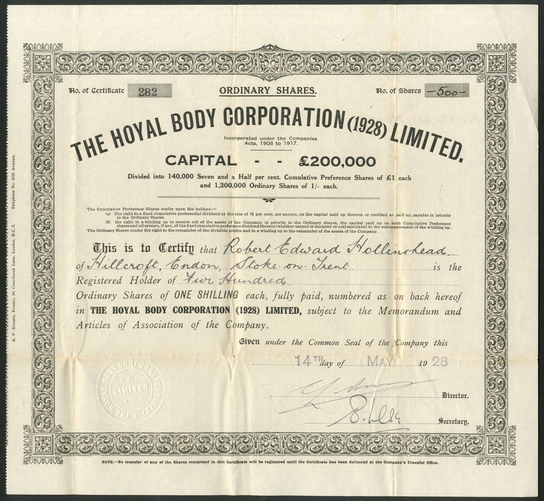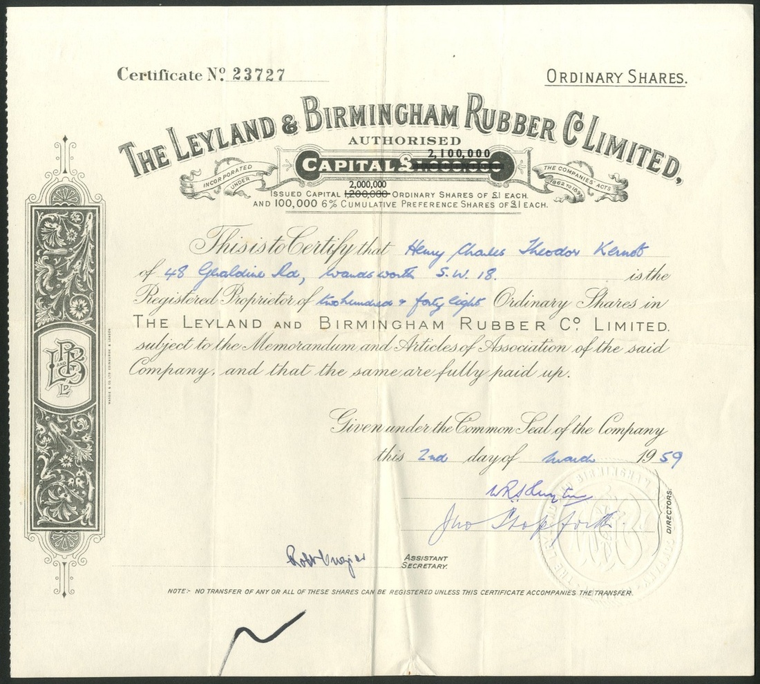 Great Britain: A collection of motoring related certificates (11), comprising A. Vedrine & Co. Ltd., £1 ordinary shares, 190[7], #1067, green. Motor body builders in Paris. Rare nominative certificate; together with Charron Ltd., 1929; Motor Petrol Association, 19[18]; British Motor Spirit Co. Ltd., 192[1]; British Motor Spirit Syndicate Ltd., 19[19], scarce type; Hoyal Body Corporation (1928) Ltd., 19[28]; British 'Orto' tyres Ltd., 191[8]; Gare Patent Tyre & Wheel Co. Ltd., 19[24]; A. Rist (1927) Ltd., 19[28], motor horn manufacturers at Lowestoft, and, Leyland and Birmingham Rubber Co. Ltd., 2 types 1954 and 1959. Generally VF or thereabouts (11).