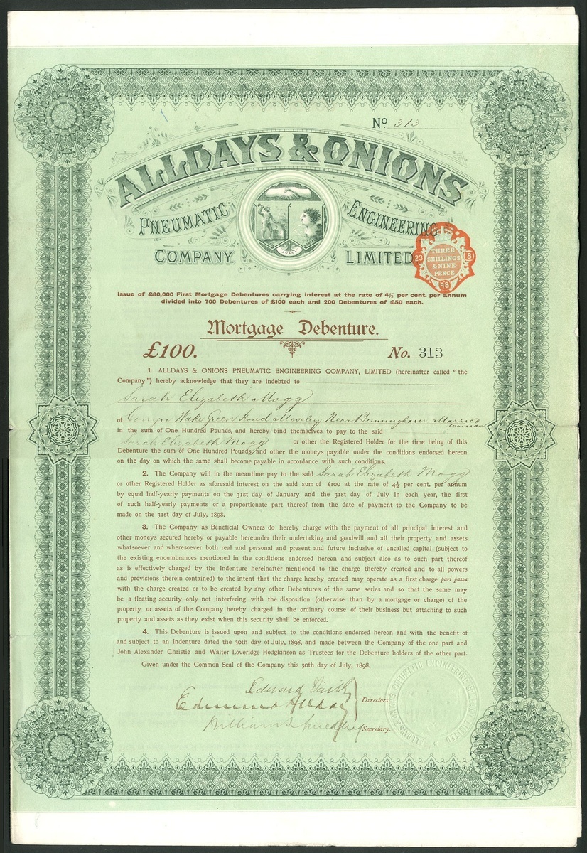 Great Britain: Alldays & Onions Pneumatic Engineering Co. Ltd., 4½% Mortgage debenture for £100, #313, 1898, large format piece with arms at top, ornate border, green and brown with green underprint, with coupons. This old Birmingham engineering company manufactured cycles and motorcycles and produced their first automobile, a small quadricycle, in 1898, followed by 7hp 4 seater model in 1900. Many more models were produced until the company merged in 1918 with Enfield which they had owned for some years. VF and scarce.