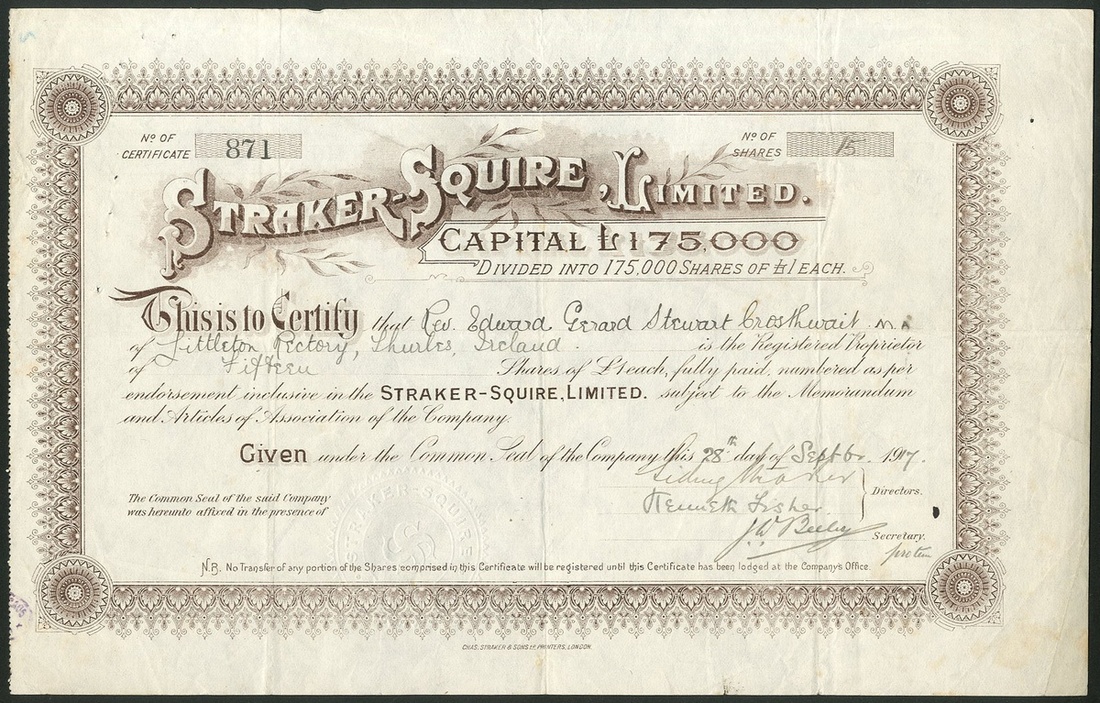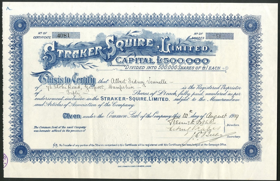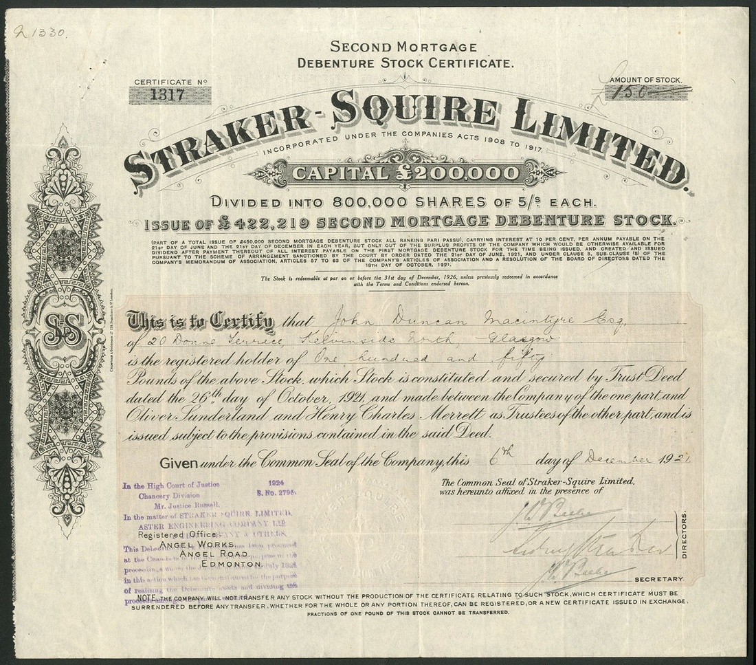Great Britain: Straker Squire Ltd., a group of certificates comprising £1 shares, 19[17], #871, capital £175,000, brown; £1 shares, 19[19], #4081, capital £500,000, signed by Sidney Straker; Second Mortgage Debenture stock, 19[21], #1317. Together with S.T.D.Motors Limited, 19[33], and Harper Bean Limited, 19[20]. Straker started building steam wagons in Bristol, joined with Squire in 1904 and continued to build commercial vehicles and buses but also French cars under licence. Progressed to cars of their own design and continued to prosper until Straker was killed in an accident in 1926. VF (5) NO RESERVE