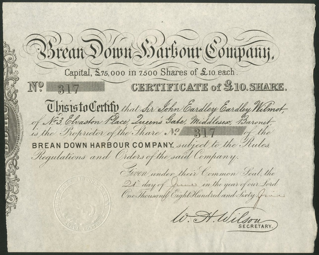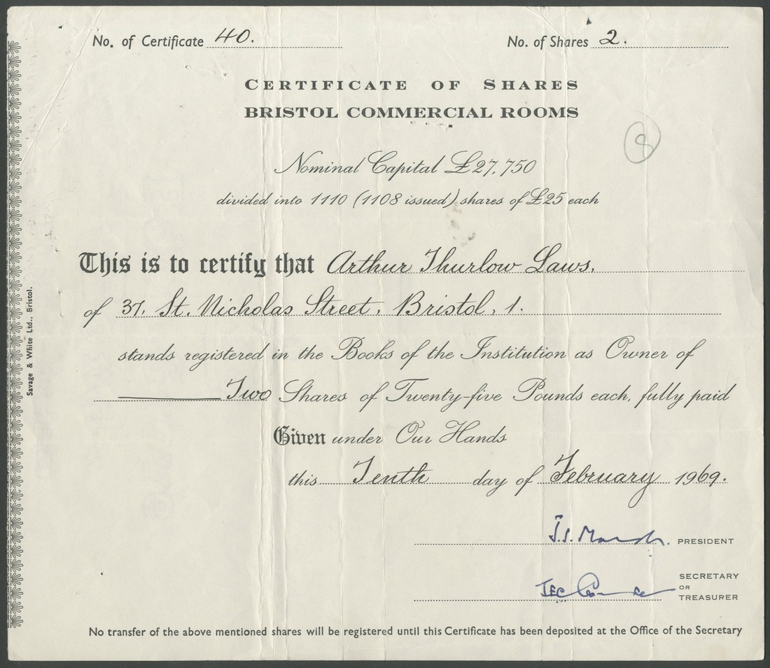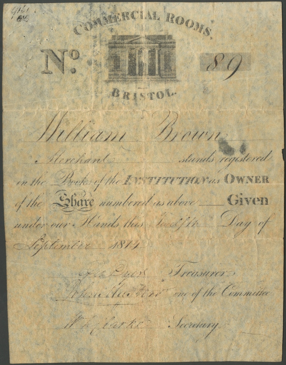 Great Britain: Commercial Rooms, Bristol, share, 18[14], #89, vignette of porticoed building at top, black printing, on vellum, together with a later share dated 1969. Also an 1865 share in Brean Down Harbour Company, #317. The first President of the club was John McAdam, the inventor of Tarmac and the club was in continual use until 1995 when the rooms were closed. In fact the certificate has a transfer recorded on the reverse as late as 1974 making this one of the longest certificates in general use. The building is now a Wetherspoons Pub. Heavily toned vellum, F and the later piece AVF. The Brean Down EF (3). NO RESERVE