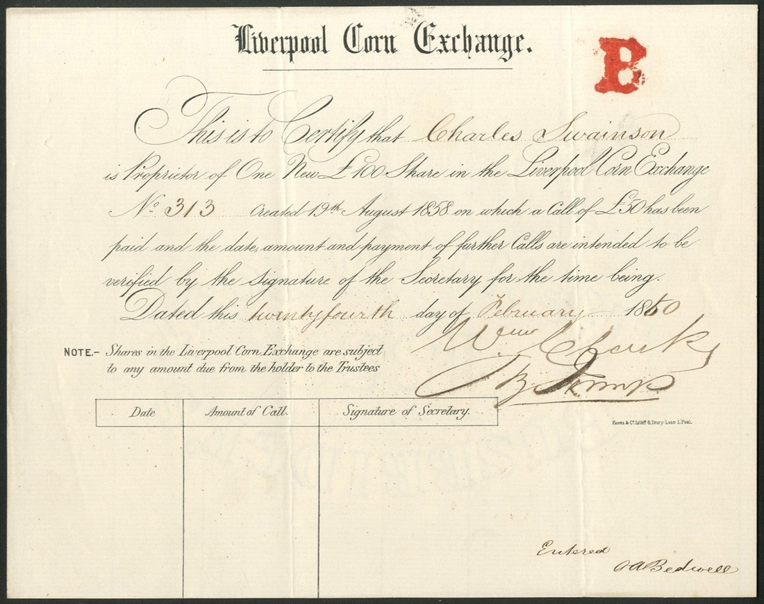 Great Britain: Liverpool Corn Exchange, £100 share, 185[60], #313, marked 'B' in red at top, black printing. Built in 1851 to replace the first exchange of 1808. Destroyed by bombing in WWII and in 1953 replaced by a new office block. This has now been converted into waterfront apartments. GVF.