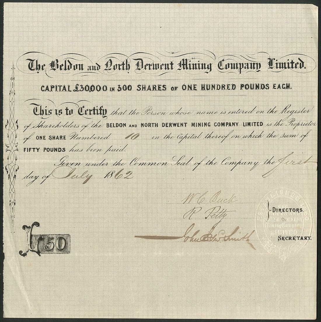 Great Britain: Beldon and North Derwent Mining Company Limited, £100 share, £50 paid, 18[62], #10, plain black print on checked paper. VF and scarce.