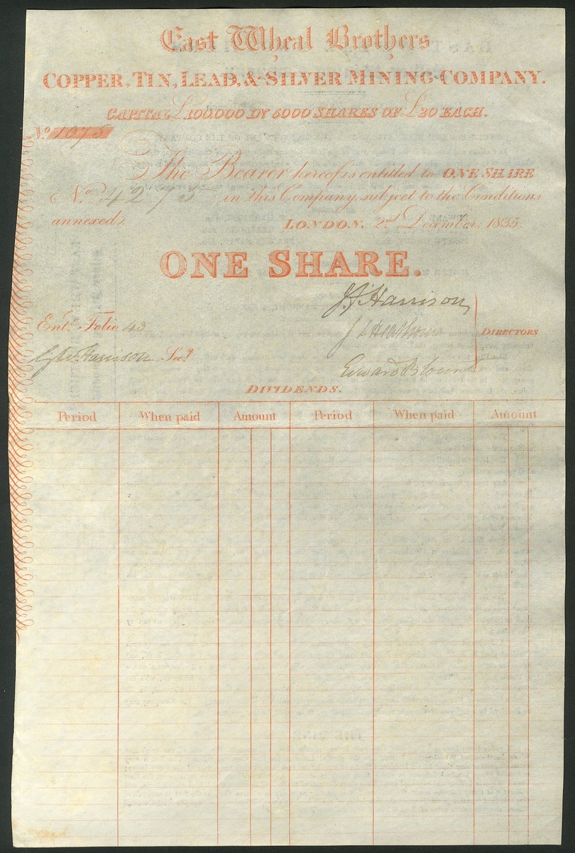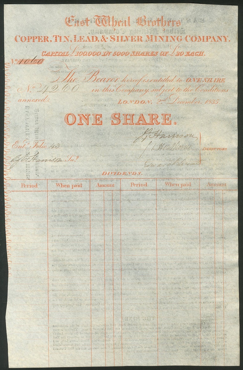 Great Britain: East Wheal Brothers Copper, Tin, Lead & Silver Mining Co., pair of certificates for 1 share of £20, London 1835, #1060 and #1075, orange/brown printing on vellum, conditions of the company printed on the reverse. Owned the Wheal Brothers and Wheal Sisters mines in Cornwall, alongside the mines of the East Cornwall Mines. GVF and scarce (2).