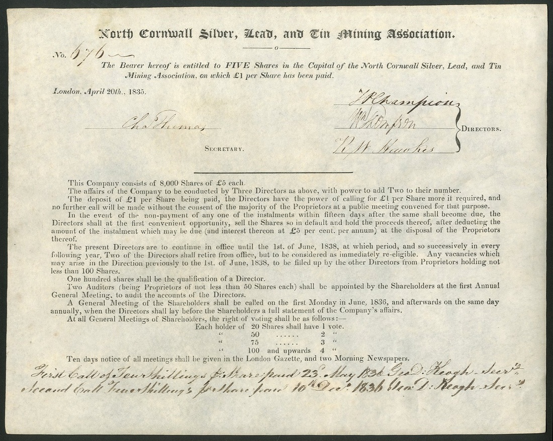 Great Britain: North Cornwall Silver, Lead, and Tin Mining Association, 5 shares, £1 per share paid, London 1835, #676, black printing, on vellum, rules in lower half with handwritten endorsements of calls paid. VF.