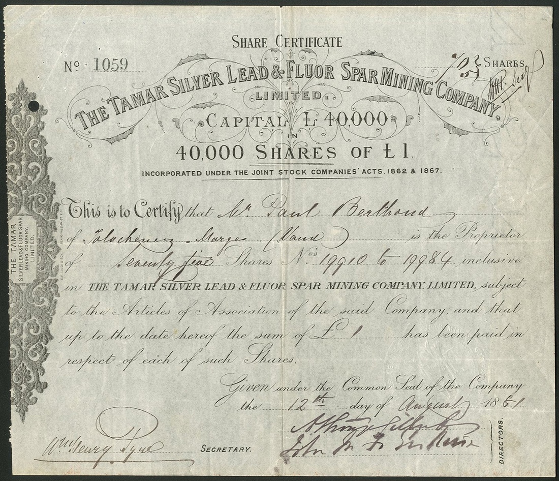 Great Britain: Tamar Silver Lead & Fluor Spar Mining Co. Ltd., £1 shares, 18[81], #1059, decorative title, black. Formed in 1878 and worked in the Bere Ferrers area of Devon. The Fluorspar (fluorite) was used as a flux in the smelting process. VF. NO RESERVE.
