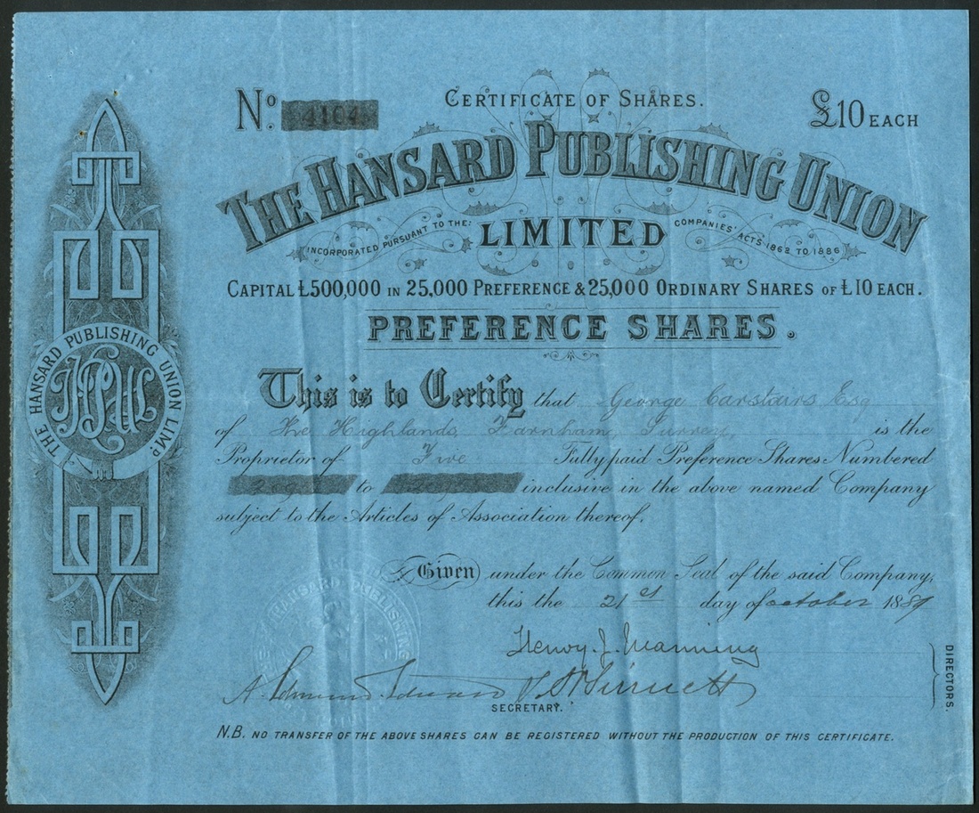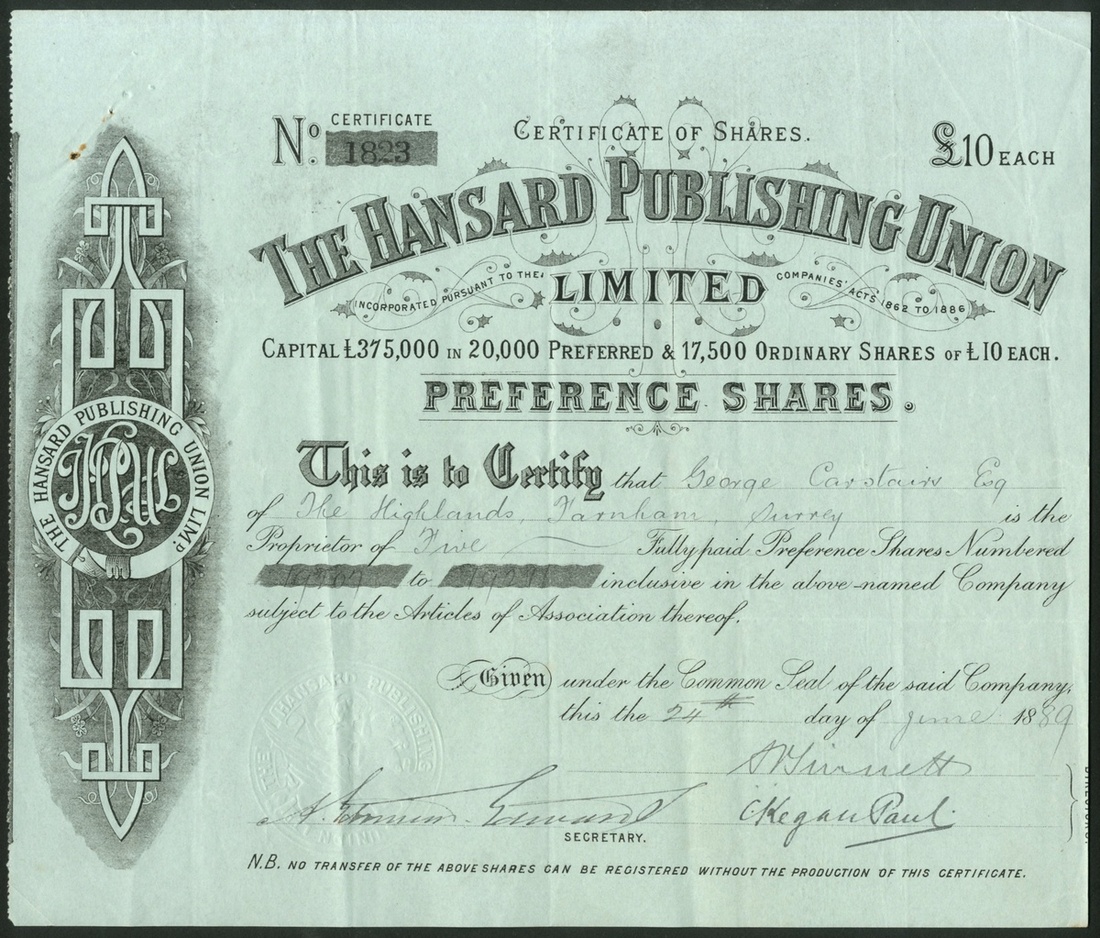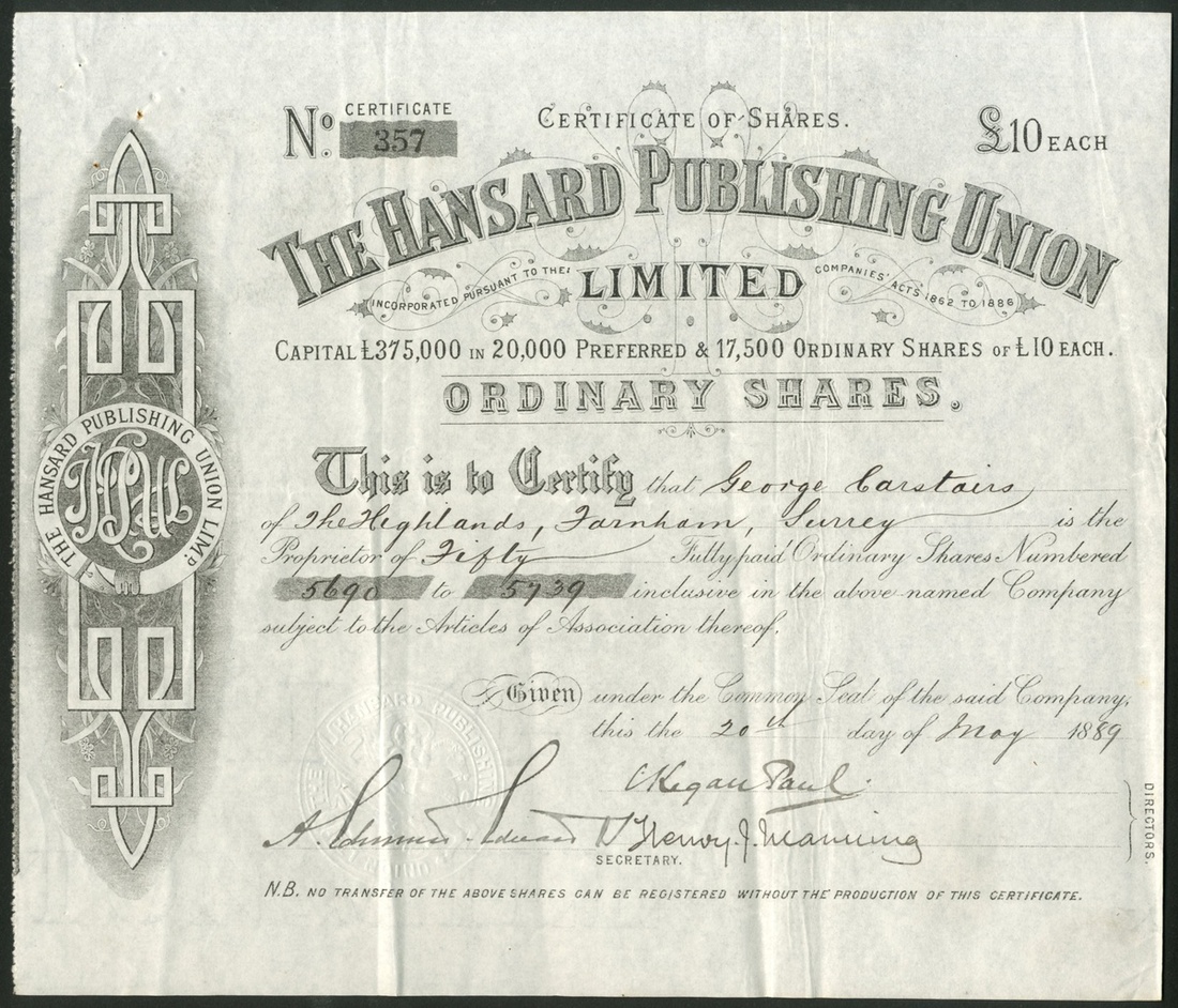 Great Britain: Hansard Publishing Union Ltd., a group of 4 different certificates comprising £10 ordinary shares and £10 preference shares, capital £375,000, and £10 ordinary shares and £10 preference shares, capital £500,000, all dated 18[89], 3 are handsigned by C. Kegan Paul. Hansard was a famous name for printing British Parliamentary debates from 1809. When Henry Hansard, the last family member involved in the business broke connection with the reports Horatio Bottomley stepped in to organise this company and also the printing firm of Kegan Paul, Trench, Trubner & Co. The rapid rise in the company's capital used for the acquisition of numerous other printing and publishing companies and the claims of fraud against Bottomley caused the failure in just 2 years. It was Bottomleys first of many appearances in court! VF (4).