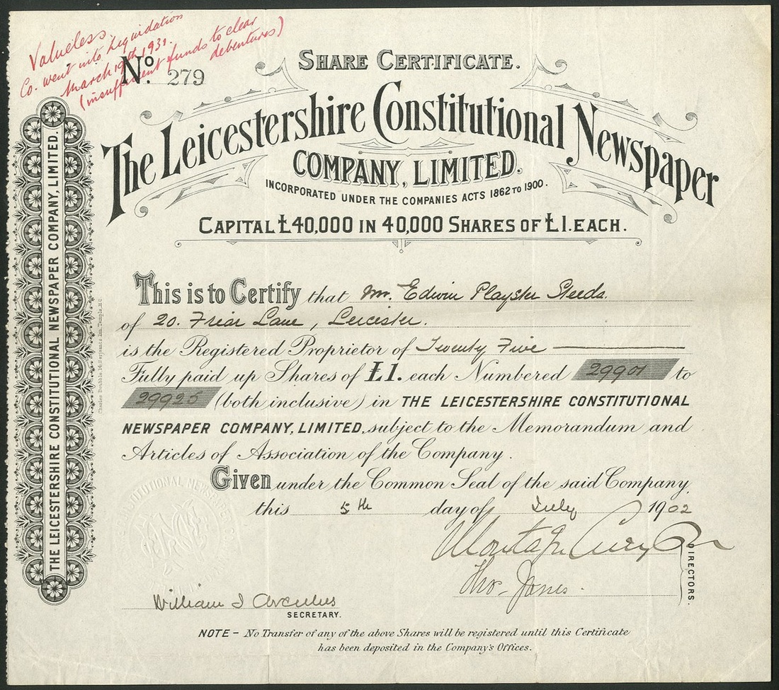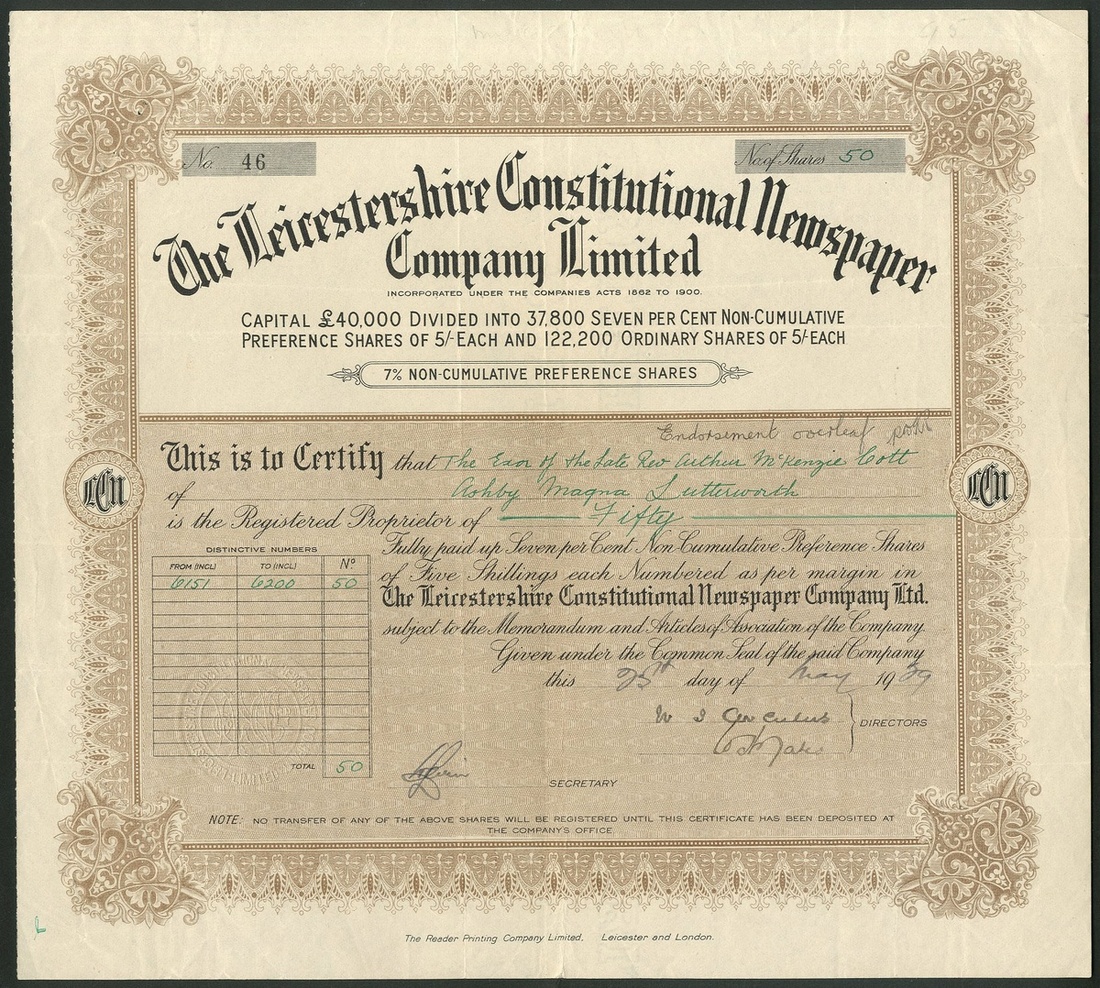 Great Britain: Leicestershire Constitutional Newspaper Company Ltd., £1 shares, 19[02], #279, black printing, together with certificate for ten 7% preference shares of 5/- each, 19[09], #46, black and brown. Couple of small edge nicks, VF (2).