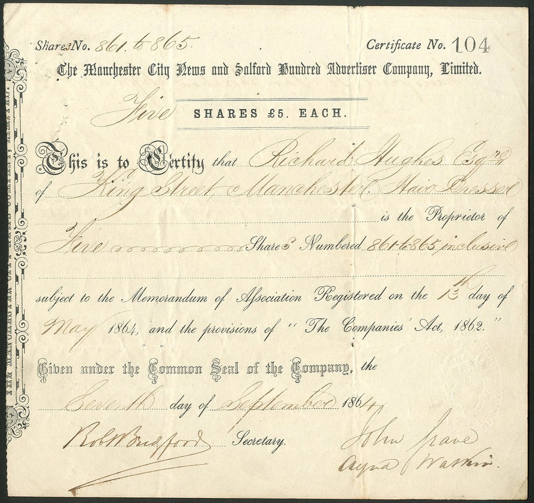 Great Britain: Manchester City News and Salford Hundred Advertiser Co. Ltd., £5 shares, 186[4], #104, black. A penny weekly paper, published in Manchester. Folds but AVF and rare.