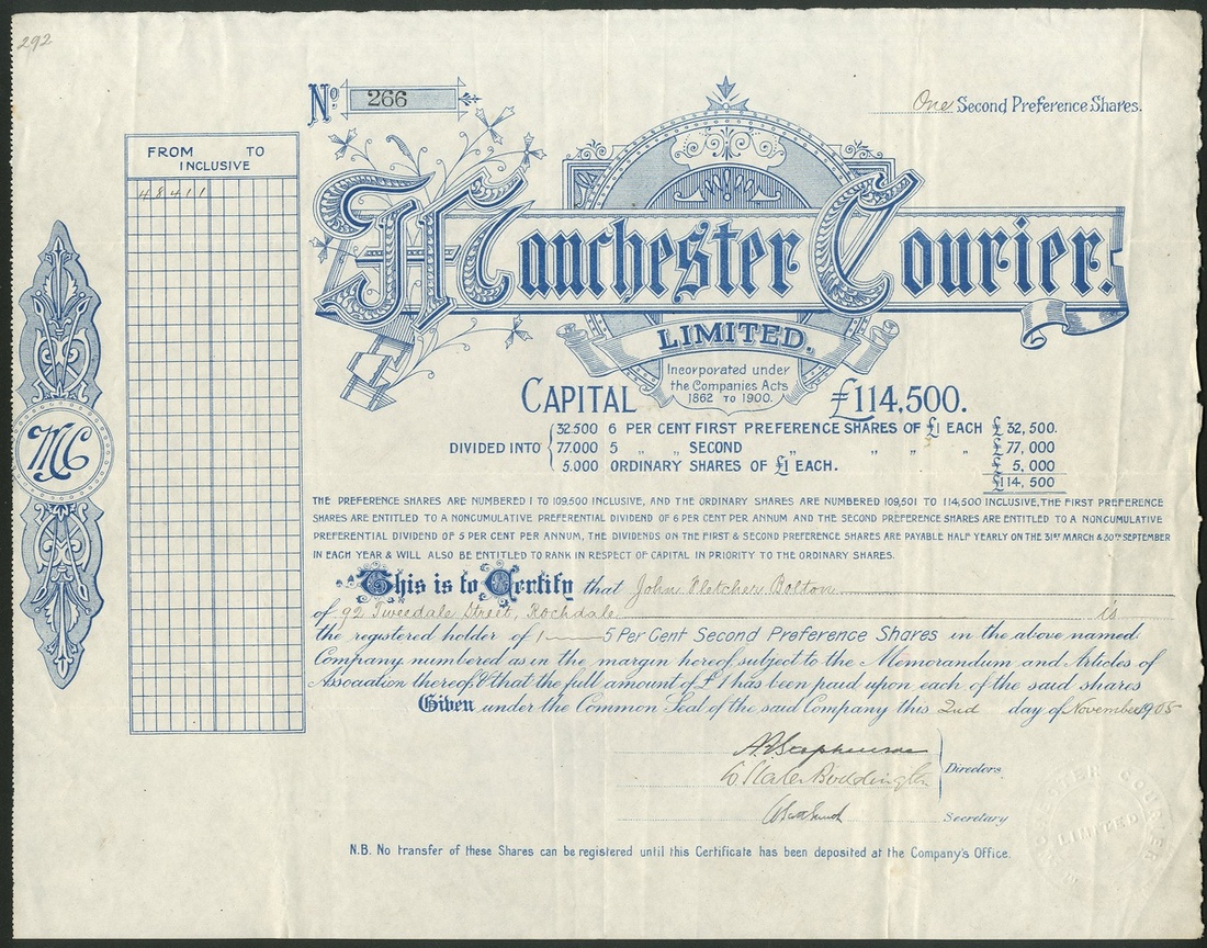 Great Britain: Manchester Courier Limited, £1 second preference shares, 19[05], #266, large format, blue. The newspaper was founded by the Sowler family in 1825 as a staunch Tory publication. It came under the control of Alfred Harmsworth (Lord Northcliffe) in 1904, represented by this company, and he installed Arthur Stephenson as managing director and he signs this certificate. Also signed by brewing magnate W. Slater Boddington, son of the founder, Henry Boddington. The paper however made losses every year and was closed in 1916. VF and scarce.