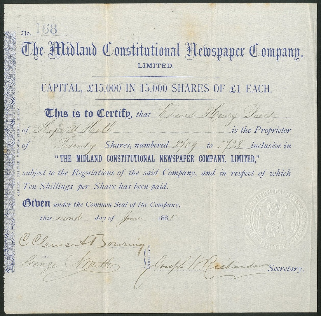Great Britain: Midland Constitutional Newspaper Co. Ltd., £1 shares, 10 shillings paid, 188(5), #168, issued to banker Edward Henry Pares of Hopwell Hall, signed by Sir Charles Clement Bowring and George Smith as directors, blue, printed in Derby. Derby based newspaper company. Sir Charles was a J.P. for Derbyshire. George Smith was a partner in Smith's Bank of Derby. VF and scarce.