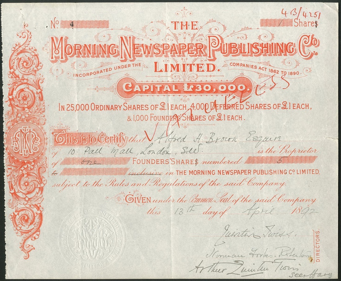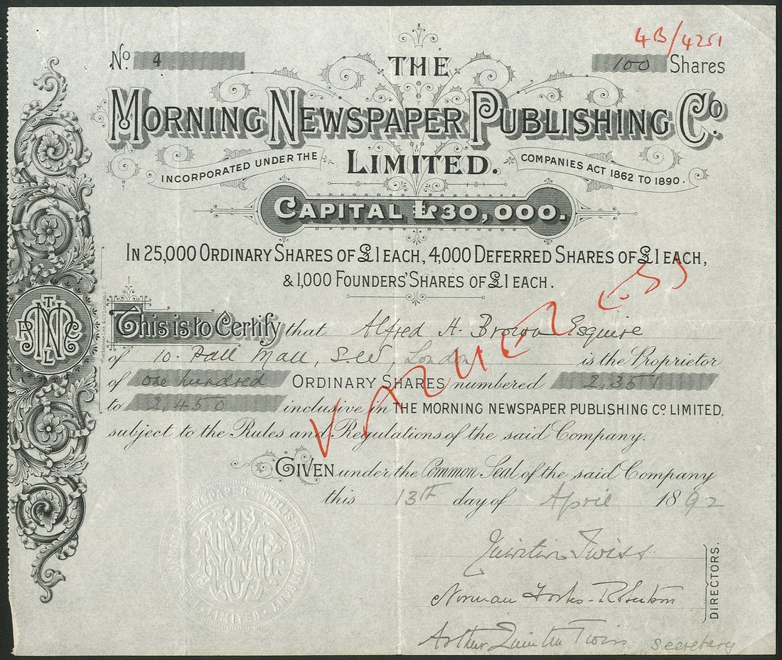 Great Britain: Morning Newspaper Publishing Co. Limited, a pair of certificates for ordinary shares and founders shares, both dated 18[92] and both #4, both signed by Quintin Twiss and Norman Forbes_Robertson as directors and Arthur Quintin Twiss as secretary. Black and red respectively, 'valueless' handwritton across face. Forbes Robertson, 1858-1932, a noted actor and friend of Ellen Terry, Henry Irving, Edward Elgar and especially Oscar Wilde. He and Bram Stoker (Dracula) organised the funeral of Henry Irving. Quintin Twiss, 1835-1900, also an actor but best known for his first class cricket career. Both GVF and first time at auction (2).