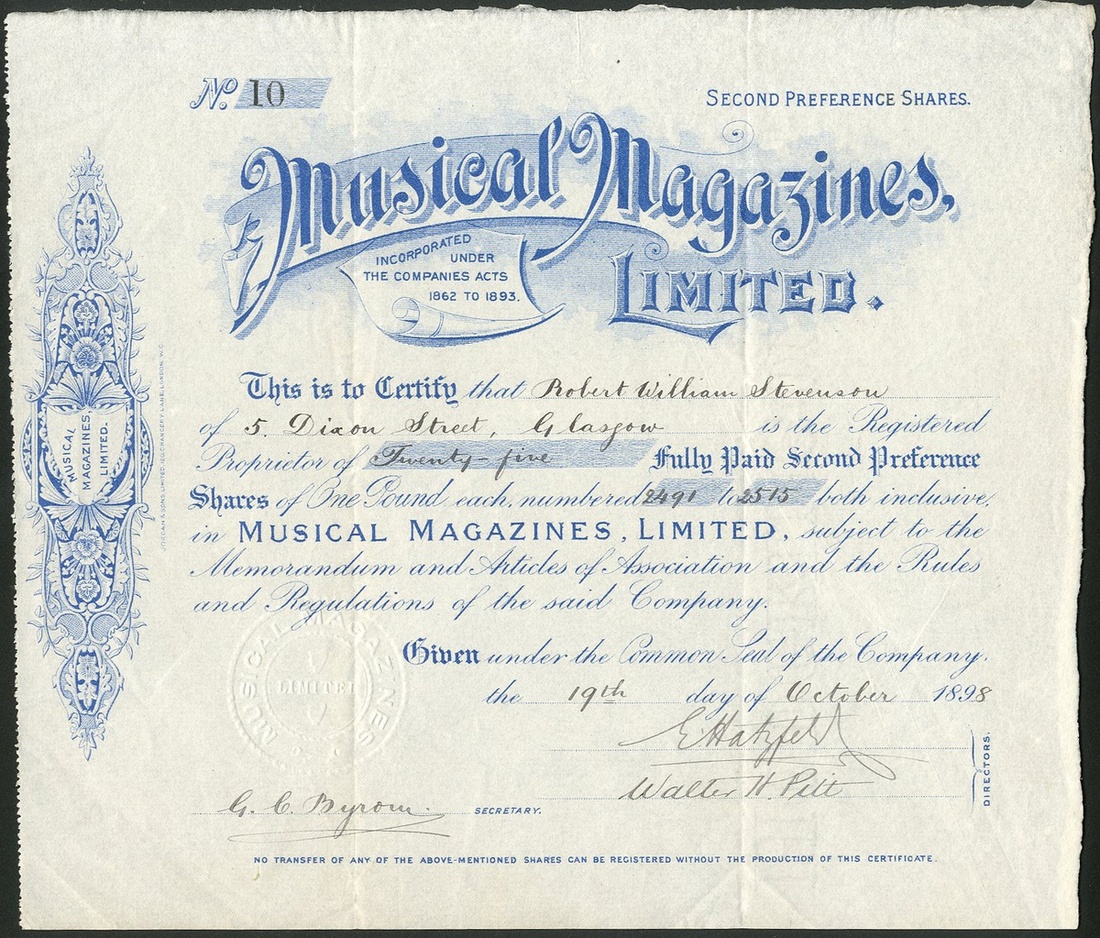 Great Britain: Musical Magazines Limited, £1 second preference shares, 189[8], #10, signed by Emile Hatzfeld, blue. The Strand Musical Magazine was published by George Newnes from 1895 to 1897 under the editorship of Hatzfeld. In 1898 this company was formed now under the ownership of Hatzfeld. The monthly magazine was relaunched in 1898 and continued until 1900. GVF.