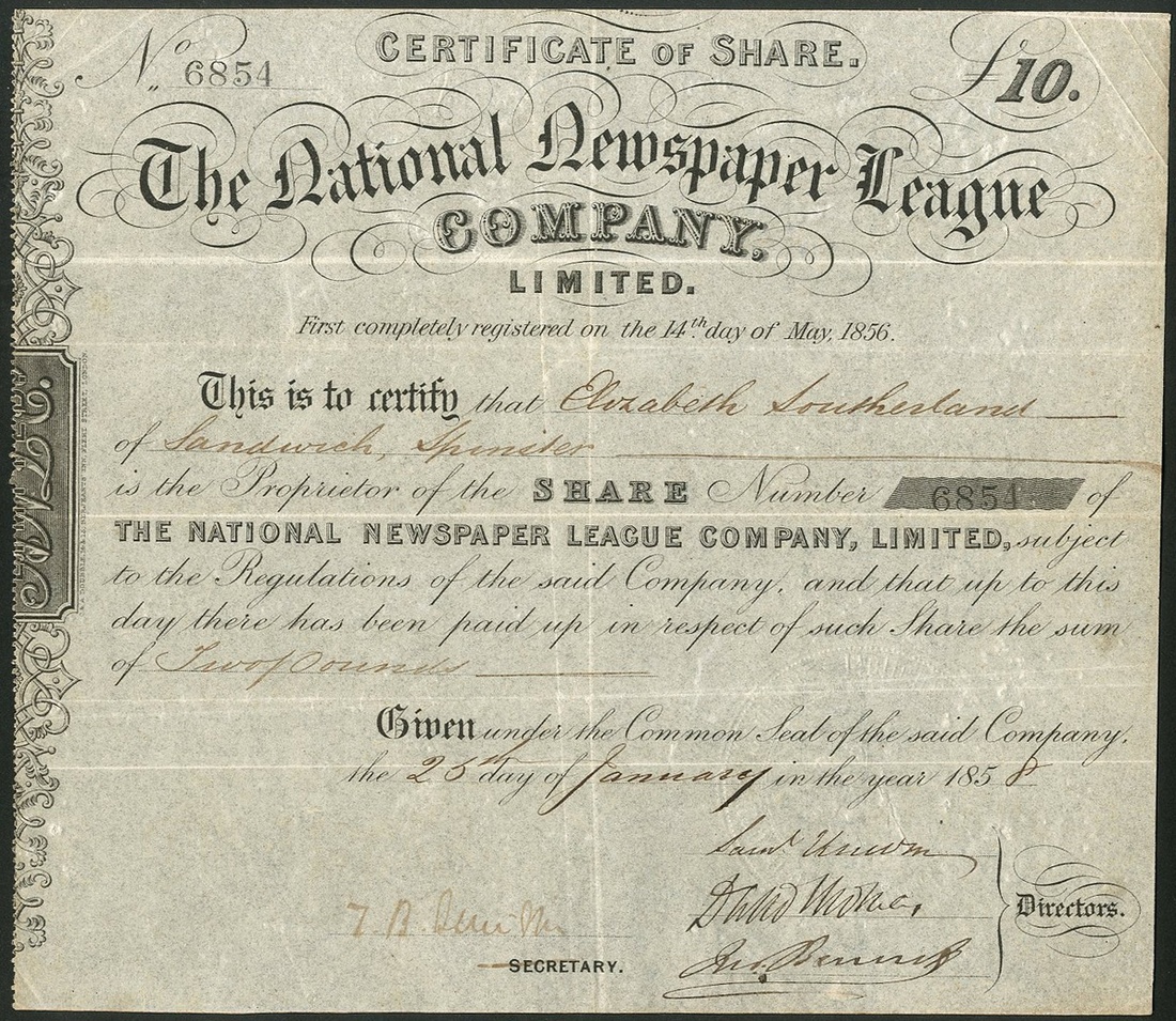 Great Britain: National Newspaper League Company Limited, £10 share, 185[8], #6854, black. Registered 14th May 1856 to produce a daily newspaper called 'The Dial' to promote Liberal thinking and values. In liquidation in 1870.VF and rare.
