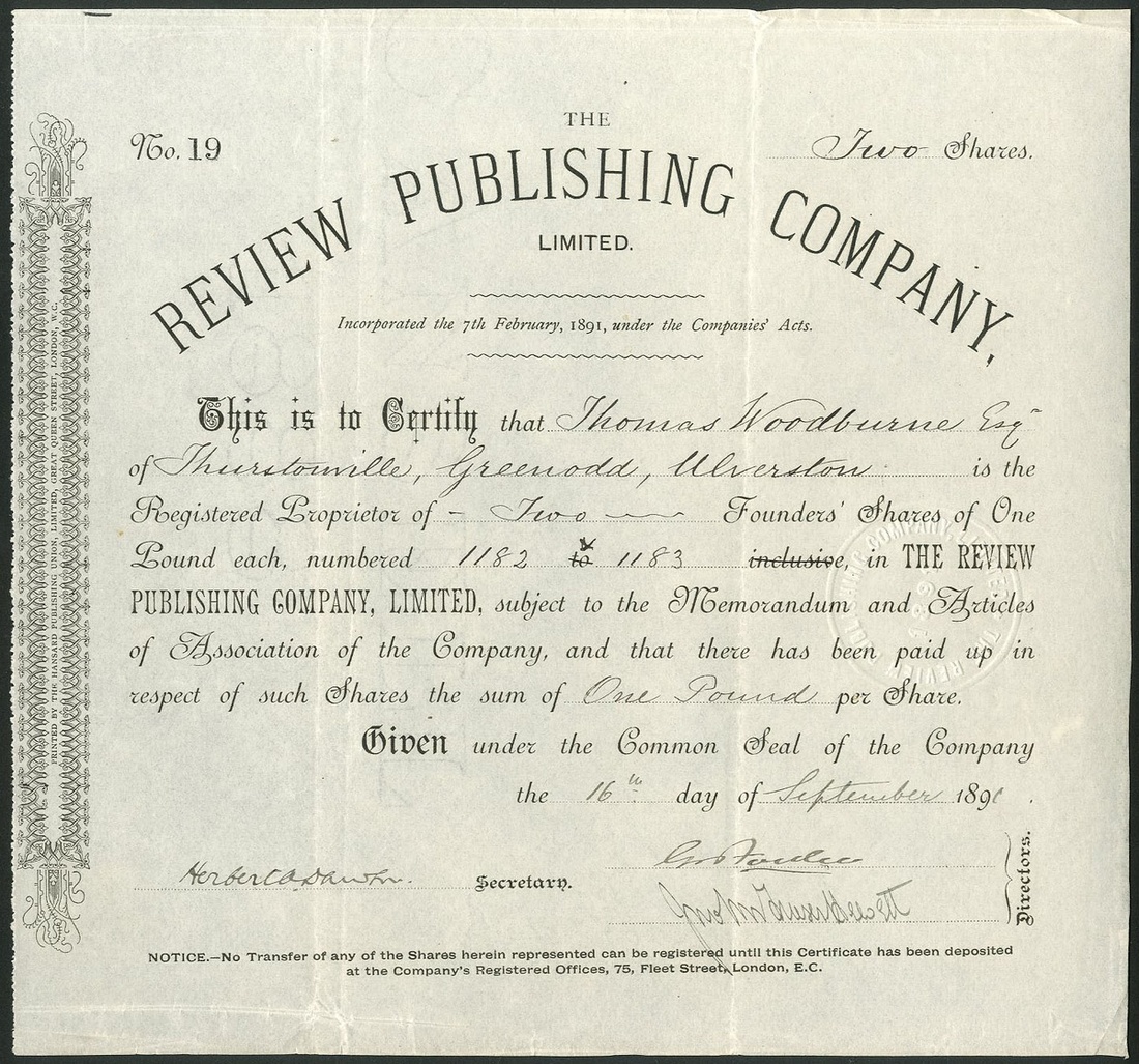 Great Britain: Review Publishing Company Ltd., a pair of certificates, ordinary shares of £10 each, 189[1], #24, blue, and founders shares of £1 each, 189[1], #19, black. The company owned two weekly papers, the Shareholders' Review and the Theological Review. Petition to wind up in 1891. VF (2).