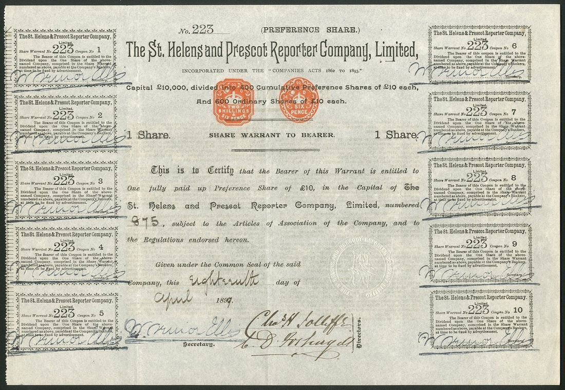 Great Britain: St. Helens and Prescot Reporter Co. Ltd., bearer warrant for 1 preference share of £10, 1897[9], #223, black. The St.Helens Reporter was founded in 1888 and has passed through many ownerships and titles and is still published today. GVF.