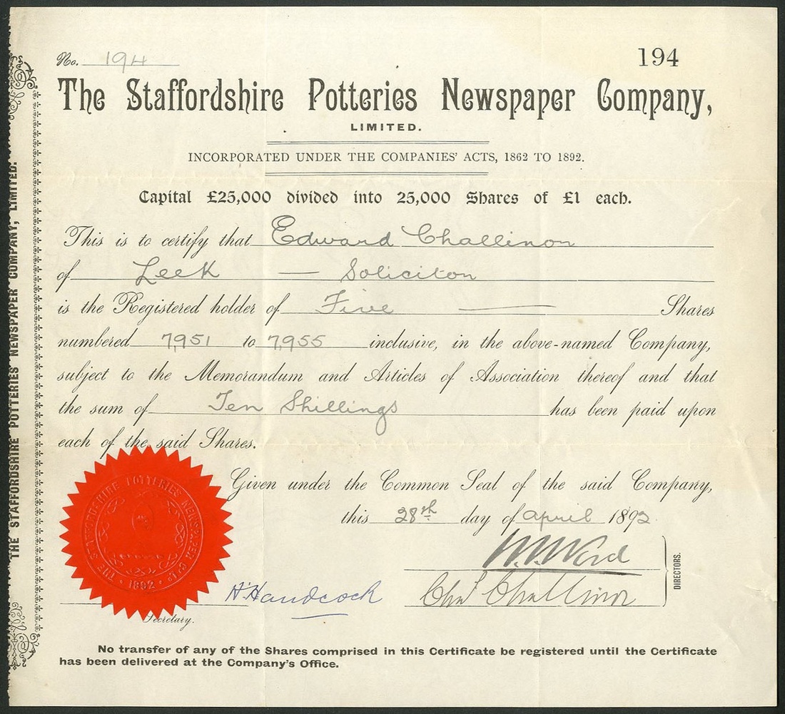 Great Britain: Staffordshire Potteries Newspaper Co. Ltd., £1 shares, 189[2], #194, black, red seal. Created from the merger of the Staffordshire Post and the Evening Sentinel. The Post ceased publication in 1896. GVF.