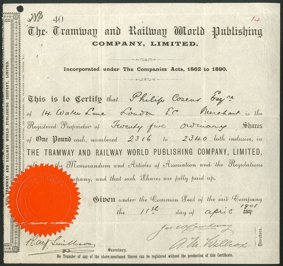 Great Britain: Tramway and Railway World Publishing Co. Ltd., £1 shares, 189[1901], #40, black, orange paper seal. Specialist newspaper statrted in 1892. Name changed to Transport World in 1942. Filing hole, VF.