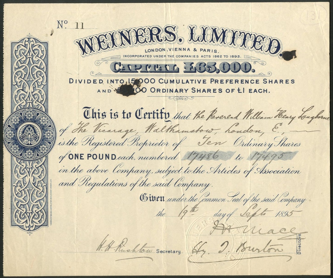 Great Britain: Weiners Ltd., £1 ordinary shares, 189[5], #11, blue with scrollwork. Formed in 1895 to acquire the business of J. Weiner Limited, art printers and lithographers with branches in Acton, London, Vienna and Paris. The Vienna branch had the sole concession for advertising in the city and suburbs. VF.