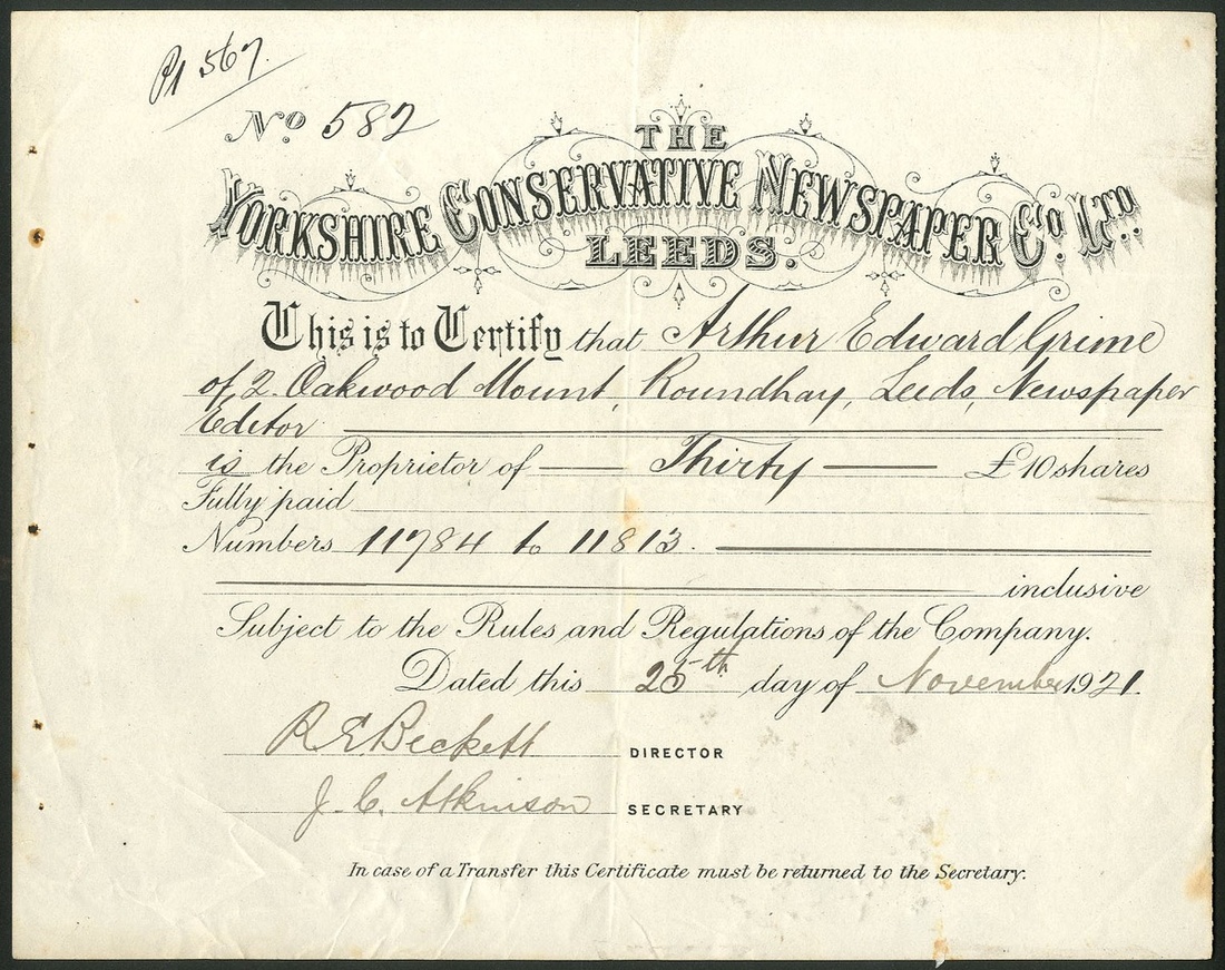 Great Britain: Yorkshire Conservative Newspaper Co. Ltd., Leeds., £10 shares, 19[21], #582, decorative title, black. Formed in 1865 to continue the publication of the Leeds Intelligencer which had been going since 1754. Renamed Yorkshire Post in the following year. The company was renamed Yorkshire Post Newspapers in 1969. Still an important publication. Some foxing, staple holes, VF.